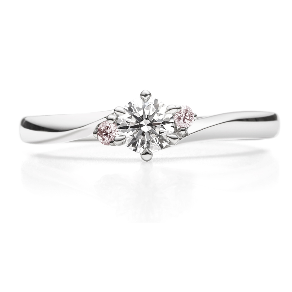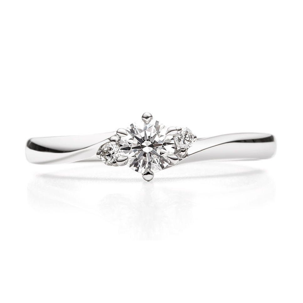 - センターダイヤモンドは6本爪です。両サイドにメレダイヤモンド(0.02ct×2)を爪留めで留めています。ダイヤモンドの輝きをより魅力的にする為に爪を他のデザインより繊細にしています。ぎゅっと抱きしめられるような左右から中央に向けて交差する腕が優しくダイヤモンドを包み込んでおり、柔らかな愛らしい仕上がりです。指輪全体のフォルムは着け心地、指当たりと素材がもつ上質さを最大限に活かせるよう、角をつけすぎず、必要以上に丸くせず仕上げています。