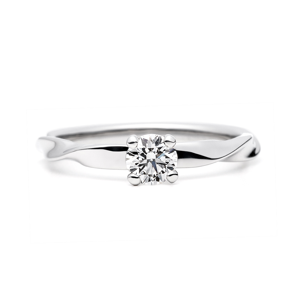 - センターダイヤモンドのセッティングは4本爪です。石枠は高さが低く、小ぶりな印象です。照り返しを大きくとり、底に向けてしっかり絞れています。横顔はダイヤモンドのガードルに向けてしっかりひらいた爪が可愛く映ります。腕は細身のストレートで左右のひねりが最大のポイントです。溶け出し混ざり合う印象をこの滑らかなひねりで表現しています。