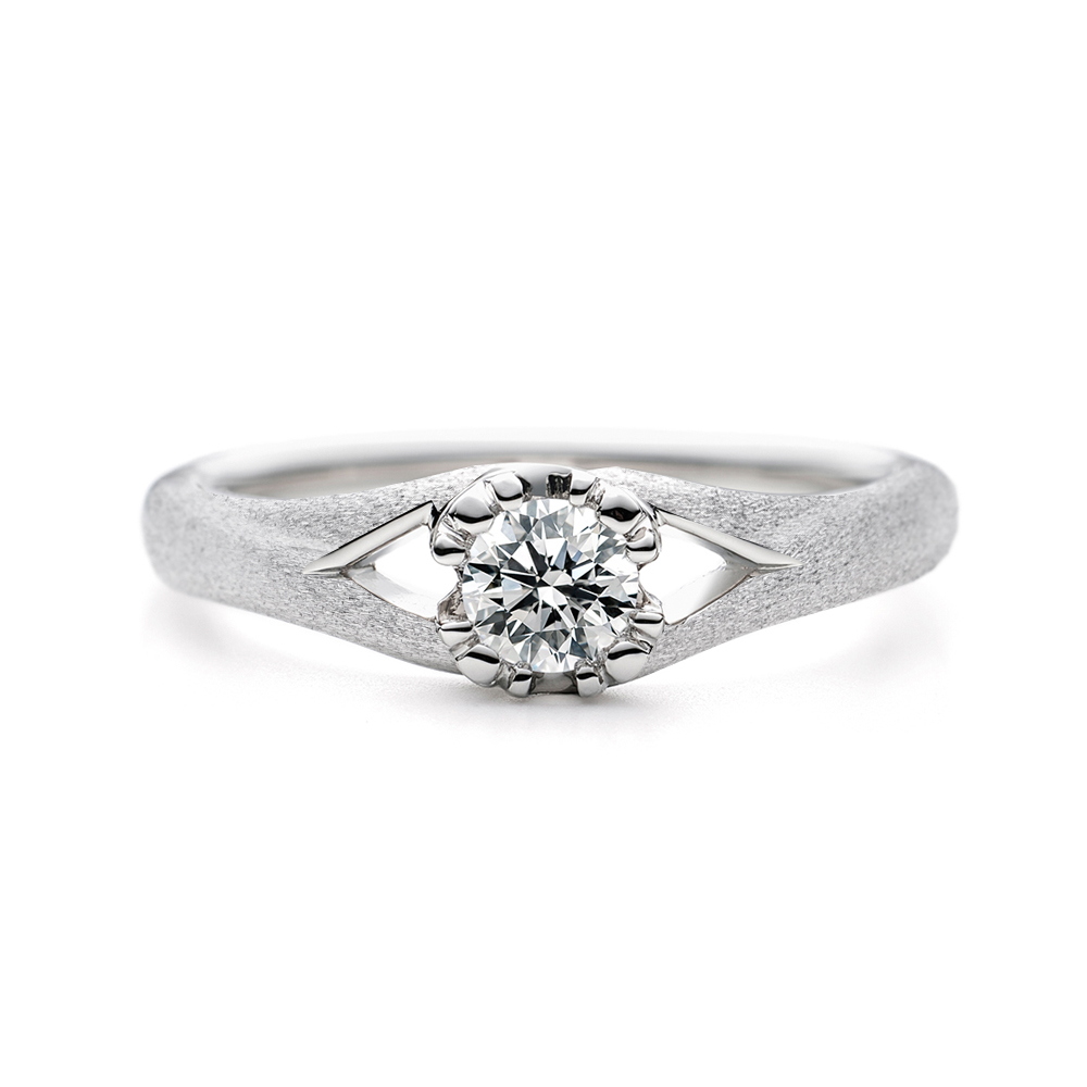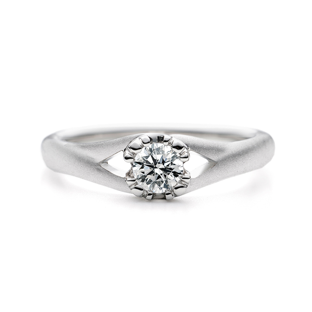 センターダイヤは4本爪のスタイルですが、各爪が3つに分かれてダイヤを留めており、花のような印象を与えます。石枠横顔は腕から爪まで繋がっていくデザインが確認できます。また腕はセンター手前で2本に分かれて各爪へと繋がっていきます。手で花束を差し出すイメージからつくりました。花束を持って想いを伝える様子、心から伝えたい言葉「好きやねん」をデザインに閉じ込めた特別な指輪です。