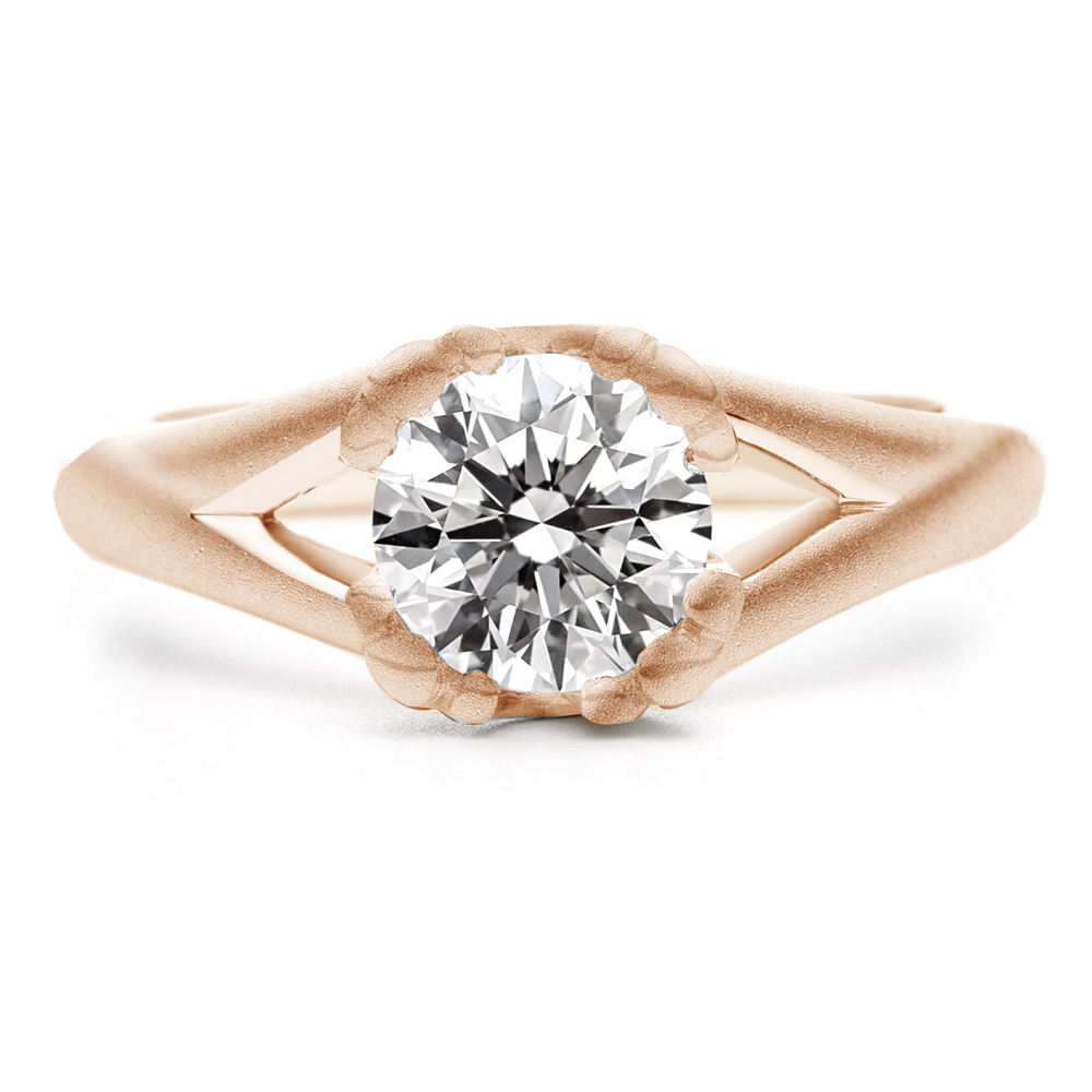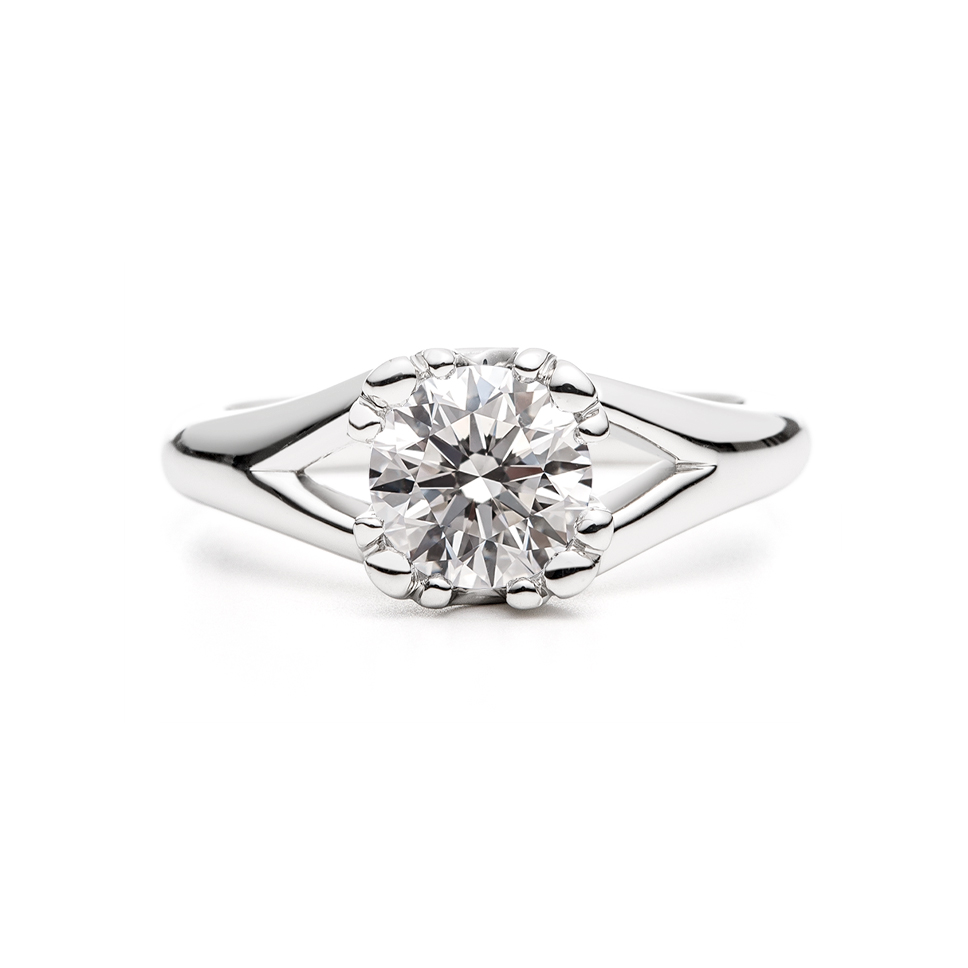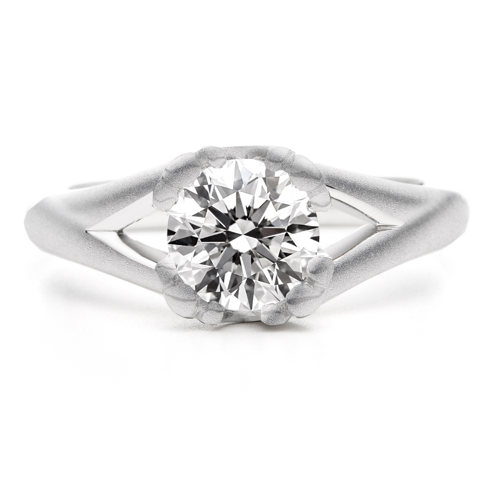 - センターダイヤは4本爪のスタイルですが、各爪が3つに分かれてダイヤを留めており、花のような印象を与えます。石枠横顔は腕から爪まで繋がっていくデザインが確認できます。また腕はセンター手前で2本に分かれて各爪へと繋がっていきます。手で花束を差し出すイメージからつくりました。花束を持って想いを伝える様子、心から伝えたい言葉「好きやねん」をデザインに閉じ込めた特別な指輪です。