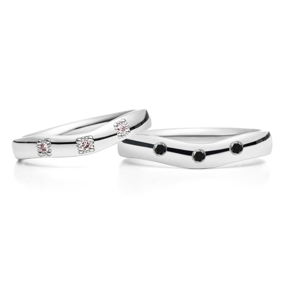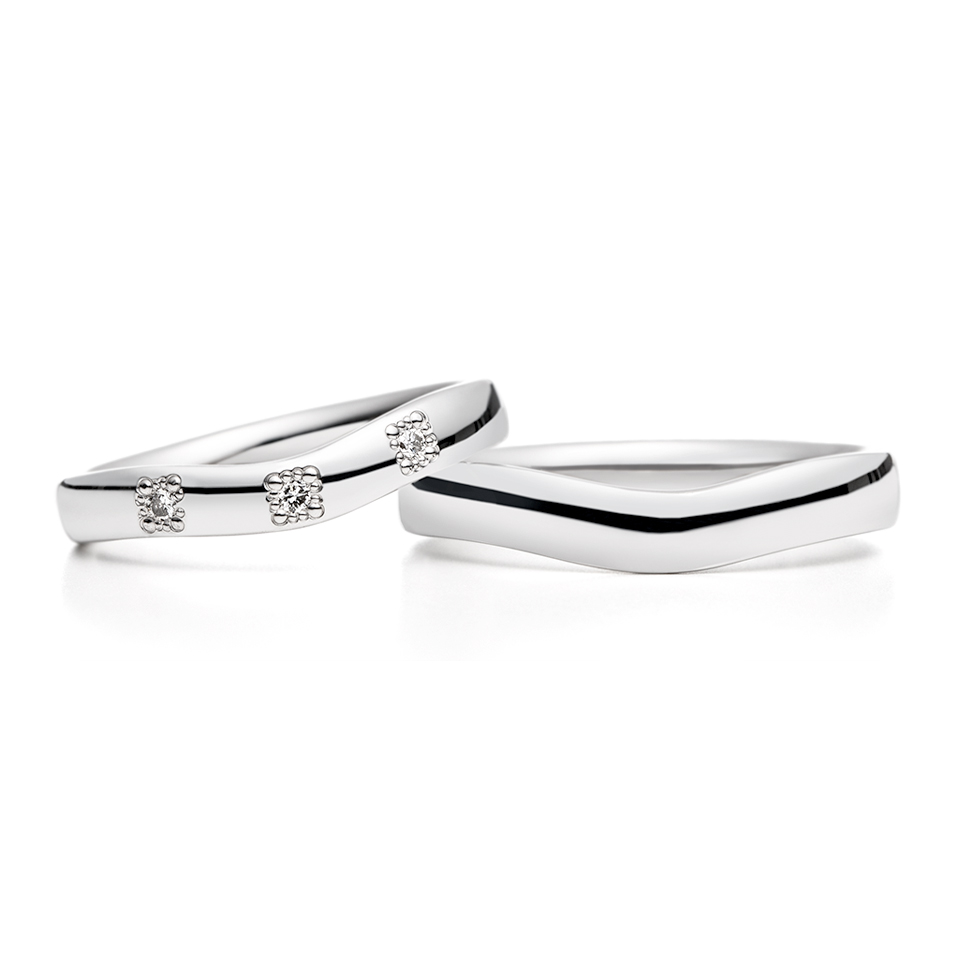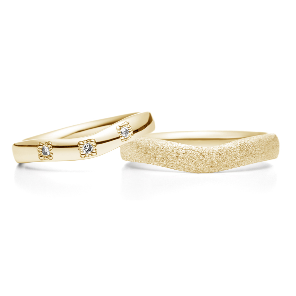 結婚指輪(左)にはメレダイヤモンド(0.02ct×3)を婚約指輪と同様に花のイメージになる特別な留め方をしています。「好きやねん」の言葉をいつまでも身に纏う事の出来る指輪です。