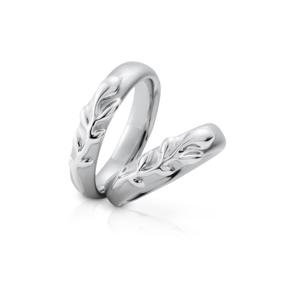 生き生きとした印象は見る人の心に雫を落とす様な潤いを感じられます。またサンドブラスト仕上げとグロス仕上げのコンビネーションがより一層葉デザインの存在感を与えています。柔らかなフォルムですので着け心地もよく、吸い付く様なフィット感が得られます。