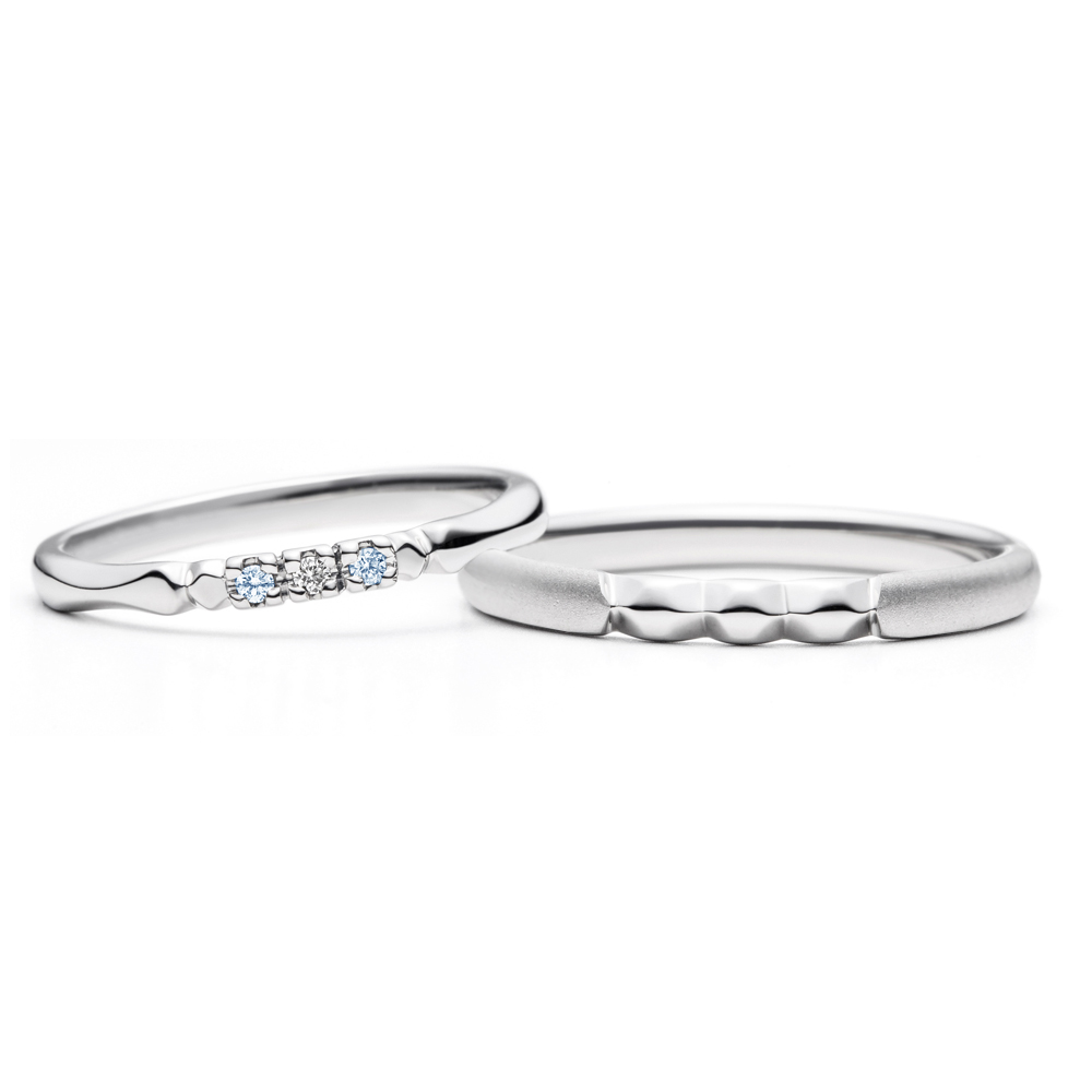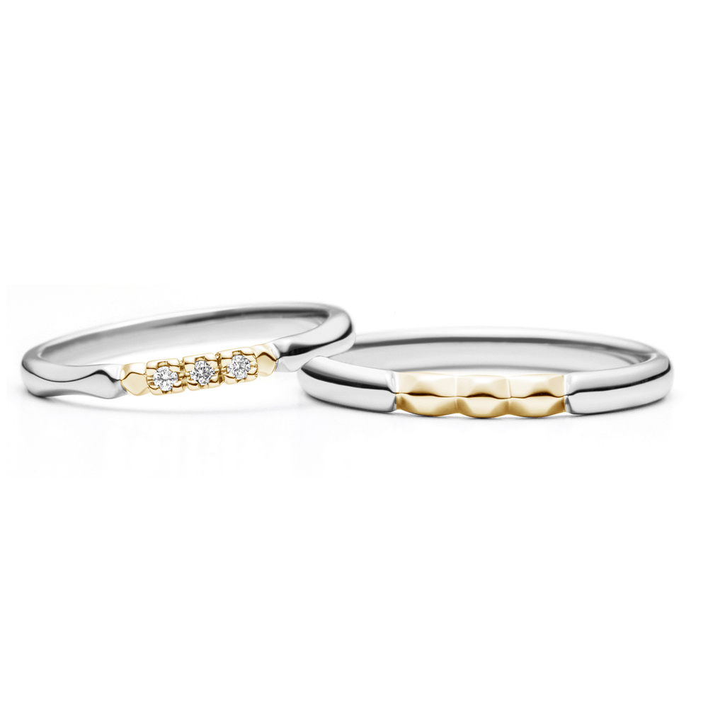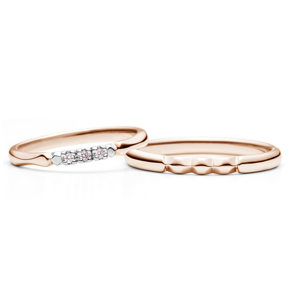 左:細身のストレートラインです。正面にメレダイヤモンド(0.01ct×3)を留めて、小粒ですがしっかりした石枠で爪もあえて大きく留めています。小さな小さなお花が並んでいる右:削り出したデザインが正面で3つ並ぶデザインです。このパーツは木の実をイメージしています。細身のシンプルな甲丸指輪に、シャープなアクセントが印象的なデザインです。