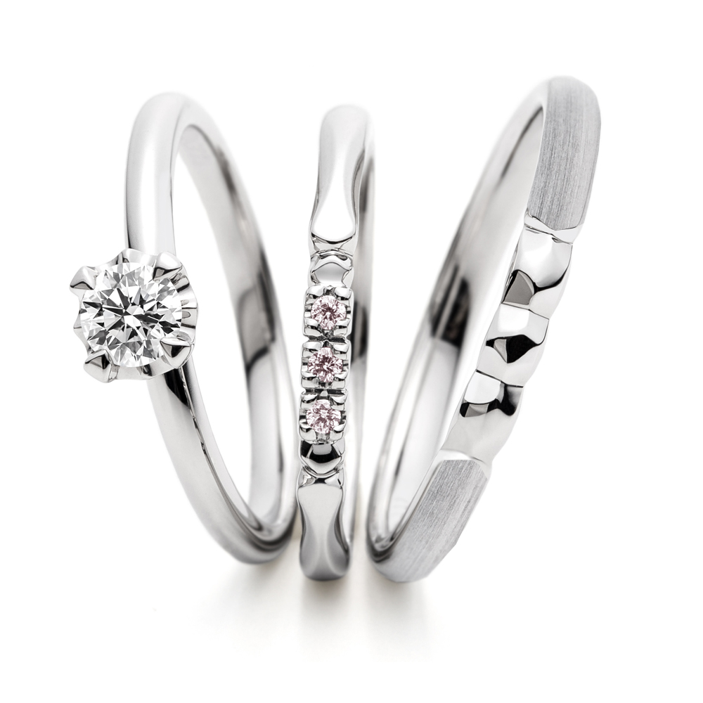結婚指輪(右):削り出したデザインが正面で3つ並ぶデザインです。このパーツは木の実をイメージしています。細身のシンプルな甲丸指輪に、シャープなアクセントが印象的なデザインです。