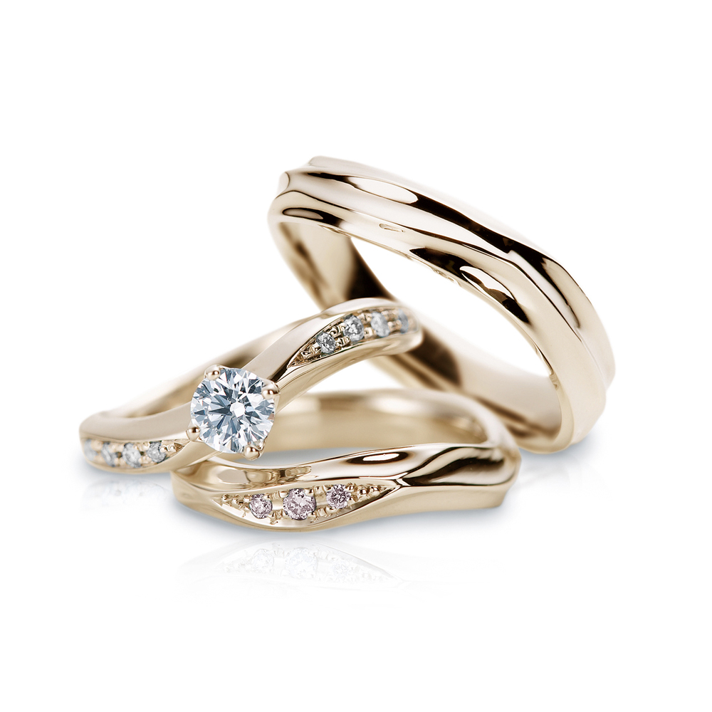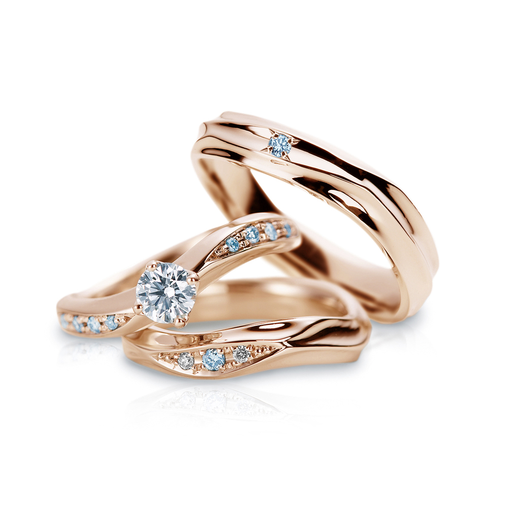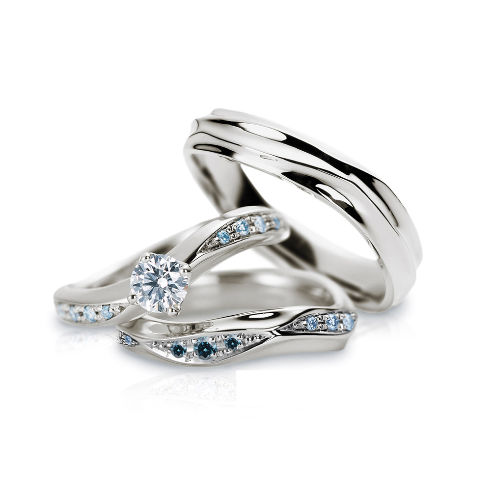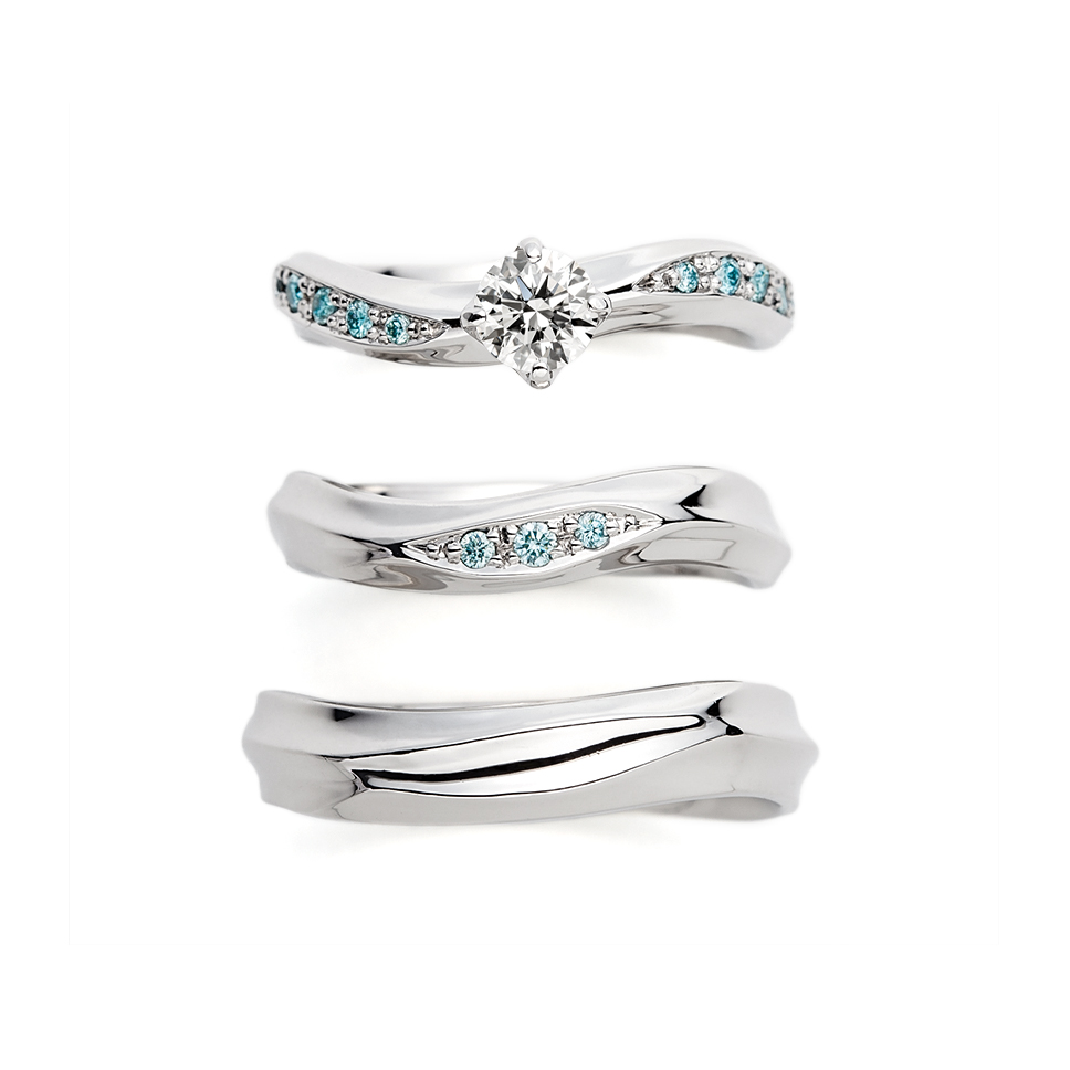 - 滑らかなウェーブラインに表面を走るテクスチャーが美しい指輪です。婚約指輪・結婚指輪(ダイヤあり)にはアイスブルーダイヤモンドモンドを留めて、瑞々しさを表現しています。プラチナの輝きに清涼感を与える心地よいウェーブが最大の特徴です。