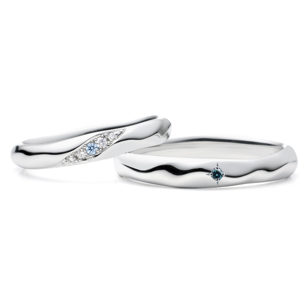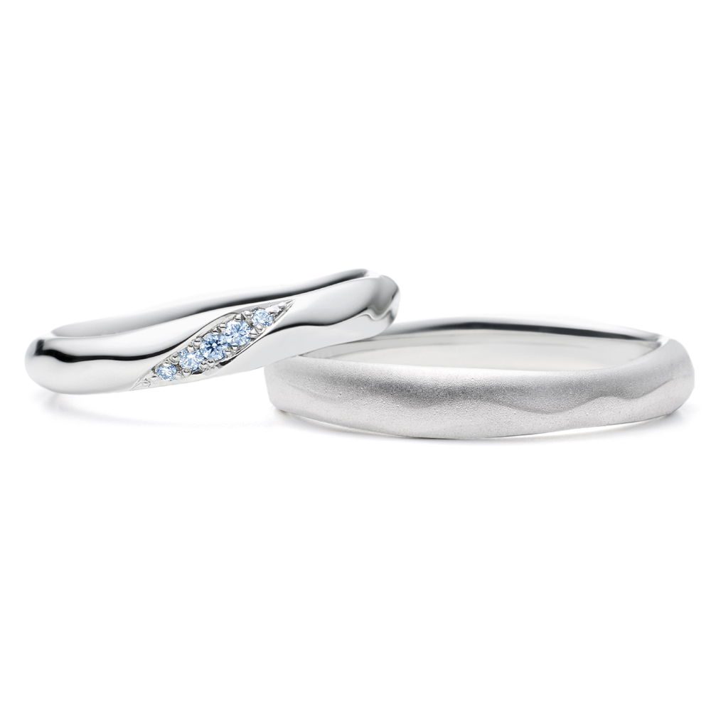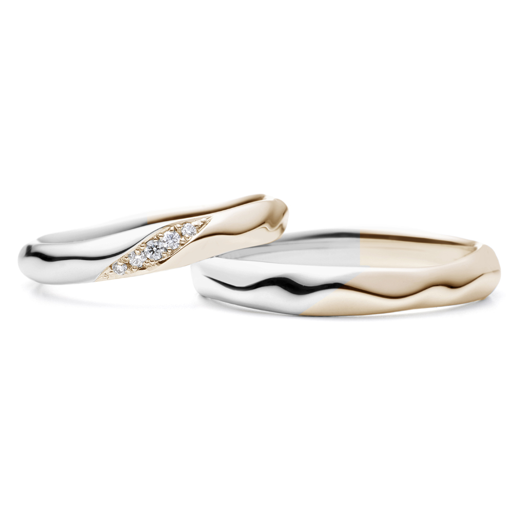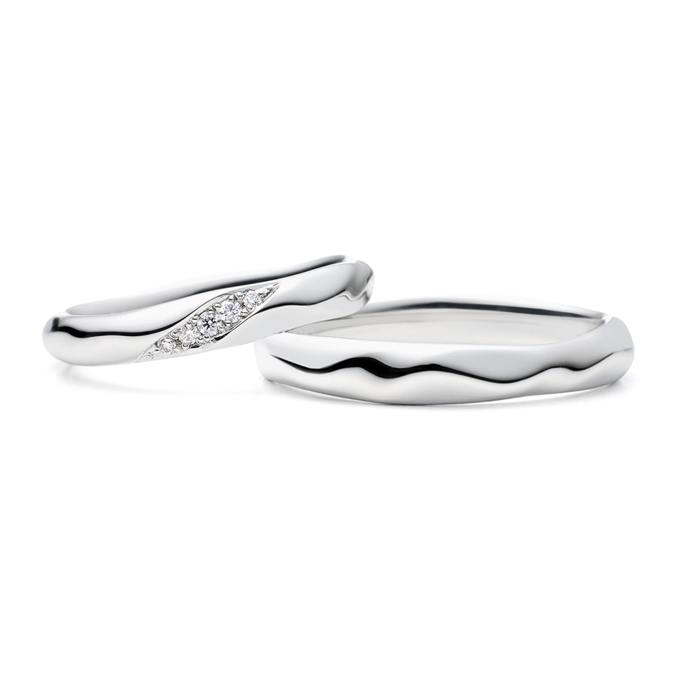 - 左:指輪が美しく波打つ滑らかなデザインです。イルミネーションに照らされた海面を思わせる光沢感が特徴的です。また滑らかな仕上がりは着け心地もとても良いです。メレダイヤモンド(0.01×3, 0.005ct×2)を斜めに流れる様に留めており、エレガントな表情をしています。