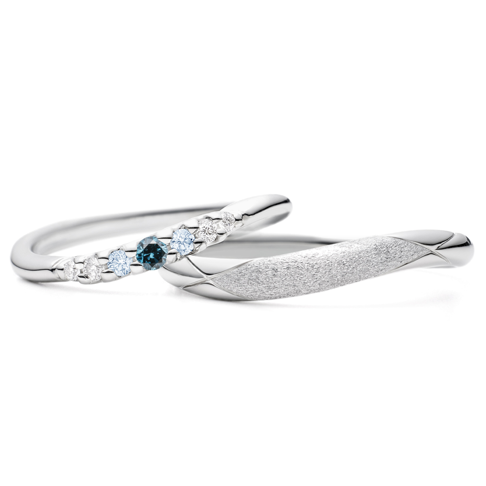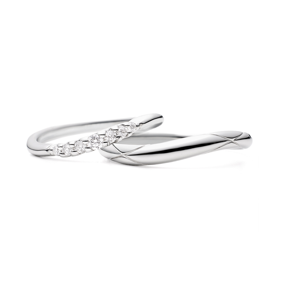 - 左:重ね着けを考慮したS字ウェーブに添うようにセッティングされたメレダイヤ(0.04ct×1、0.02ct×2、0.015ct×2、0.01ct×2)が美しく輝きます。ひっかかりのない、まろやかな爪留めが特徴です。