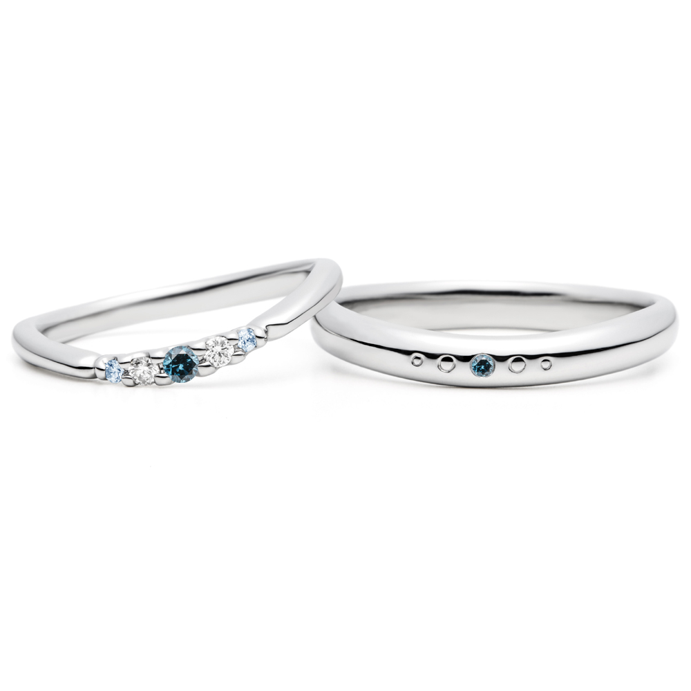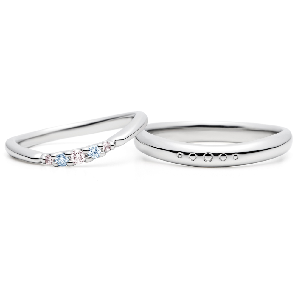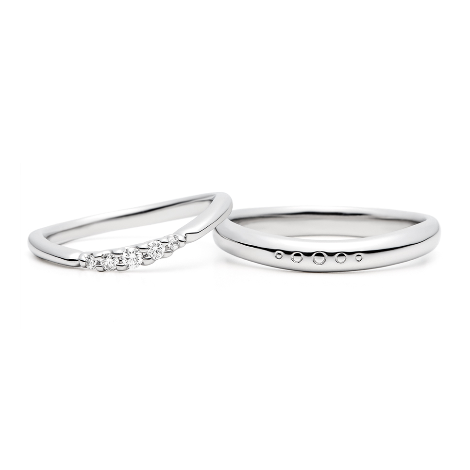 - 左:細身でU字のウェーブラインです。正面には婚約指輪と同様、5枚の花びらをイメージしたメレダイヤモンド(0.04ct×1, 0.02ct×2, 0.01ct×2)を爪留めにて大きさがグラデーションになるよう留めています。隣のメレダイヤモンドを同時に留める共有爪で留めることで、輝きの一体感をつくり、まとまって花を咲かせるジャスミンを表現しています。