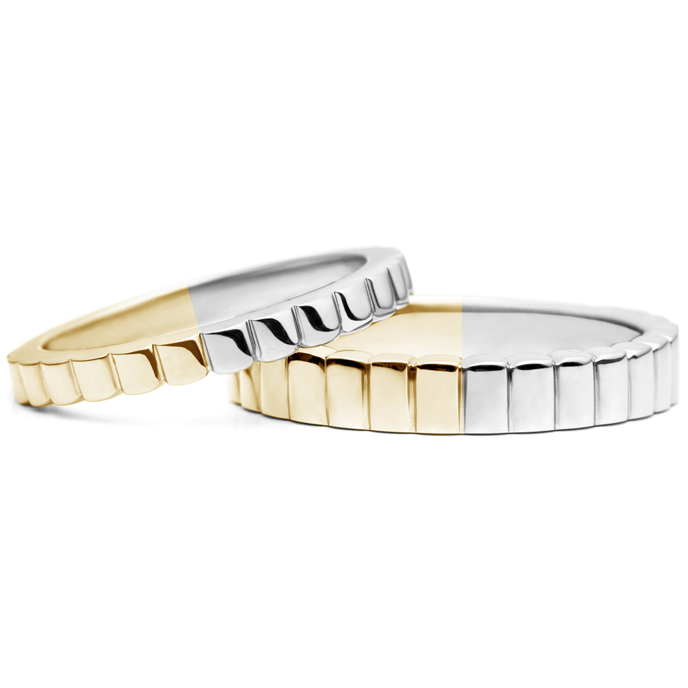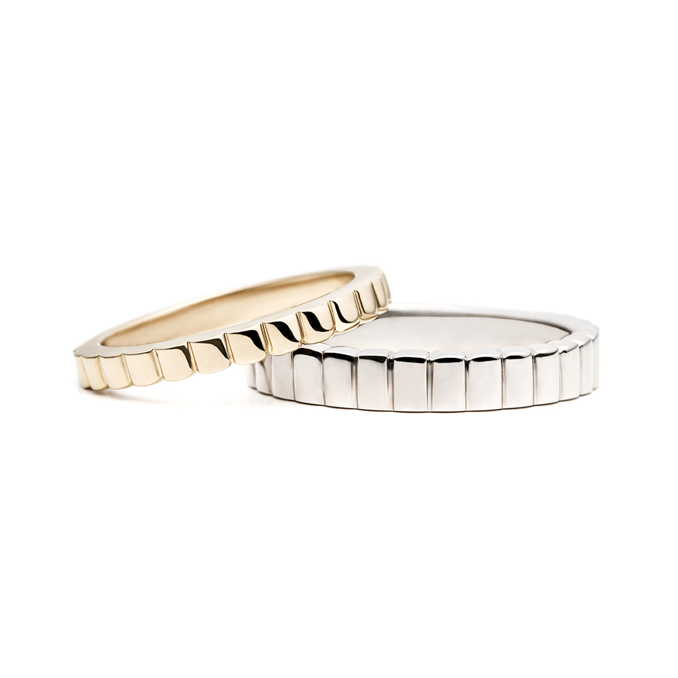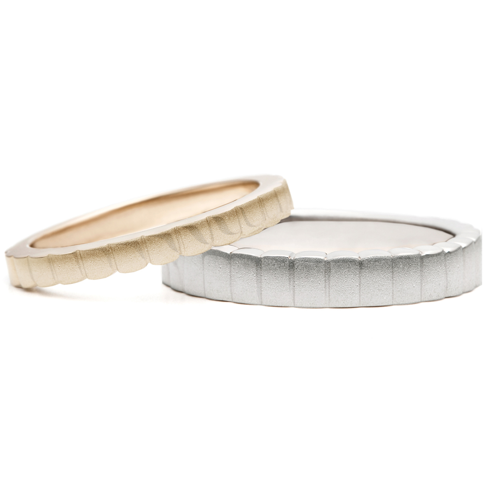 - 1つの指輪を2つに分けて造られたデザインです。婚約指輪と同様に連なるパーツは菊花をモチーフとしています。幾何学的な美しさがあります。婚約指輪との重ね着けも美しく、その華やかさは大輪の菊のようです。結婚指輪(左)はK18シャンパンゴールド、結婚指輪(右)はK18ホワイトゴールドです。色違い、幅違いでそれぞれ違った印象が楽しめます。