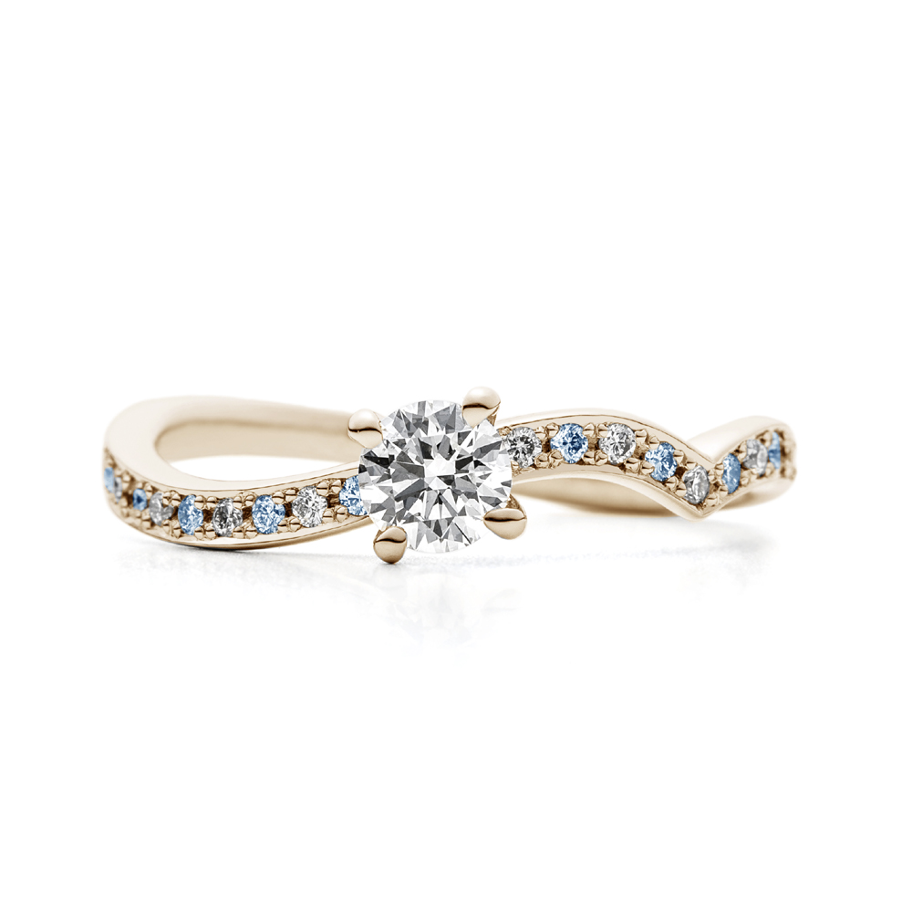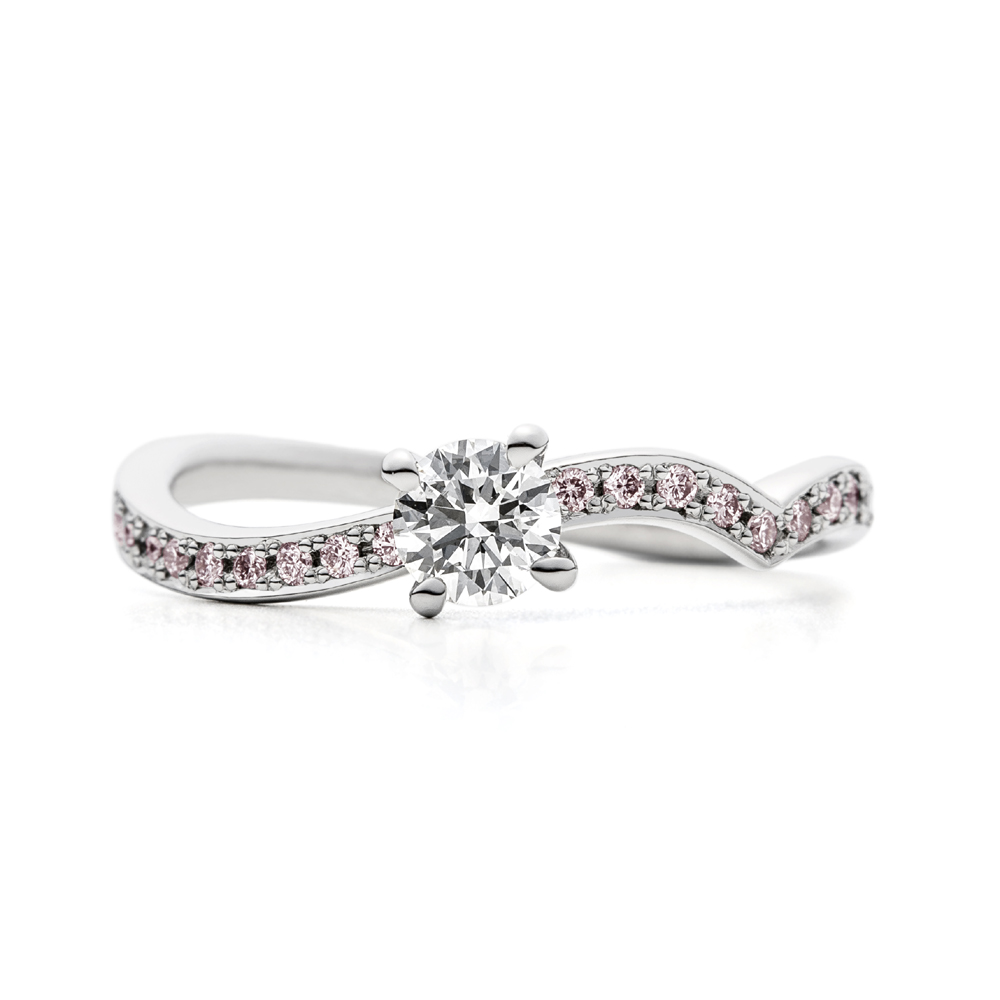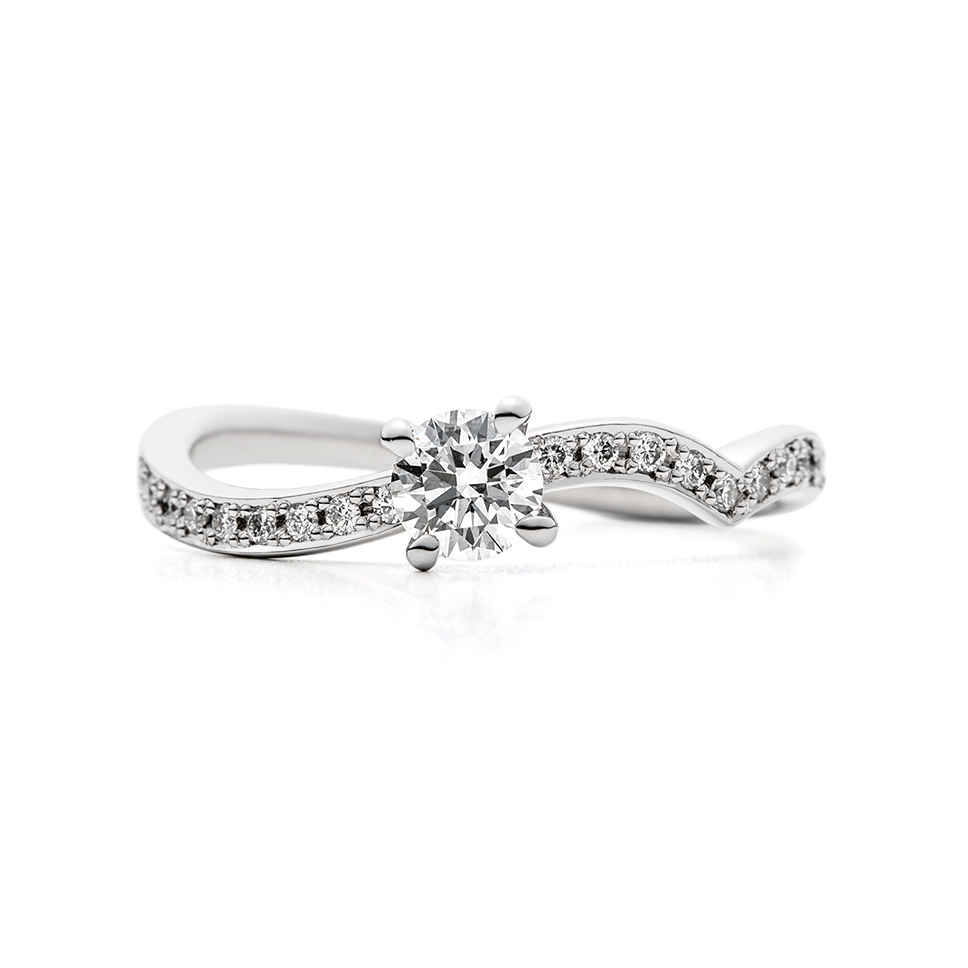 センターダイヤモンドは4本爪です。です。簡素な美しさを求めて追及された形に、ダイヤが立体的に大きく見えるバランスに整えています。S字ラインをベースにハートの動きのある細身のシルエットが特徴的です。メレダイヤモンド(0.005ct×23)を贅沢にあしらい、見る角度によってふわりと浮かぶハートを象ることにより贈る人と受取る人の心を繋ぐ事を表現しています。
