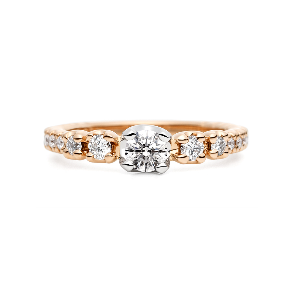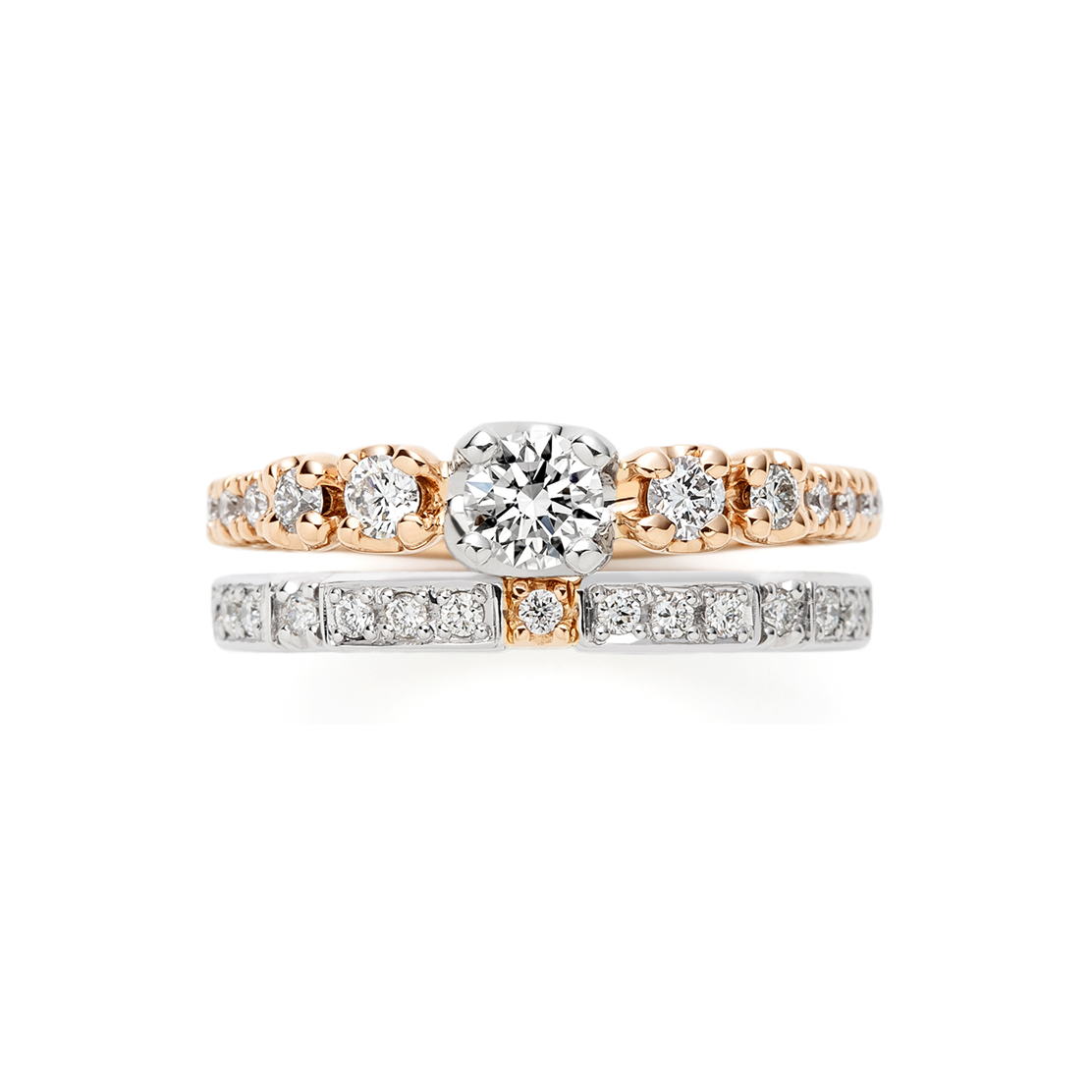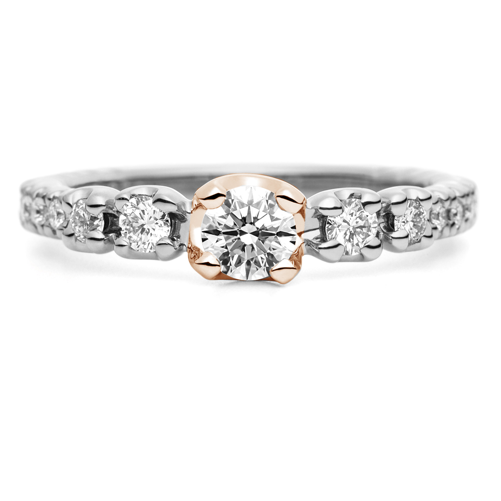 - 中央の石枠がプラチナ、腕がK18ピンクゴールドで石枠のつながりで構成しいます。センターダイヤモンドは4本爪です。で少し照り返しを見せるタイプの石枠でプラチナの白い輝きがダイヤモンドを引き立たせます。高さ大粒のメレダイヤモンド(0.007ct×2、0.03ct×2,0.01ct×16)を丸みのある石枠で留め、側面からの見え方が可愛いです。センターダイヤモンドの高さを抑えて引っかかりを軽減しています。