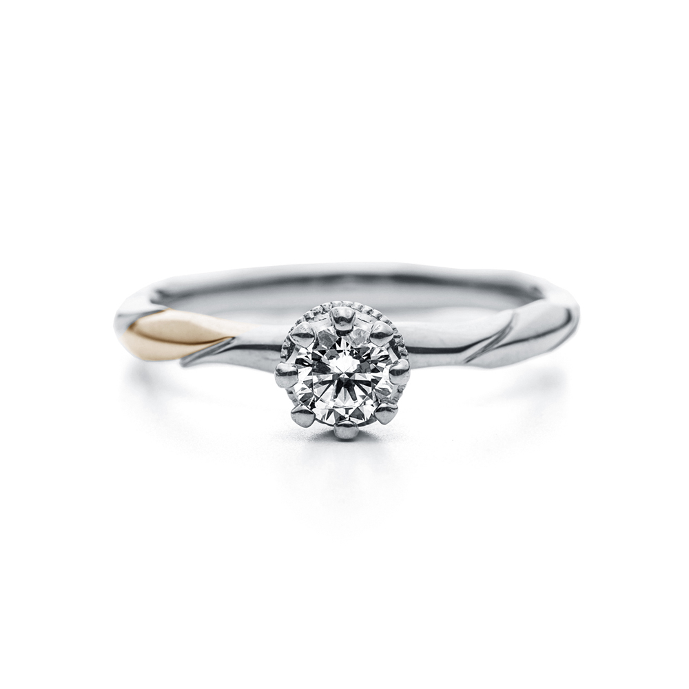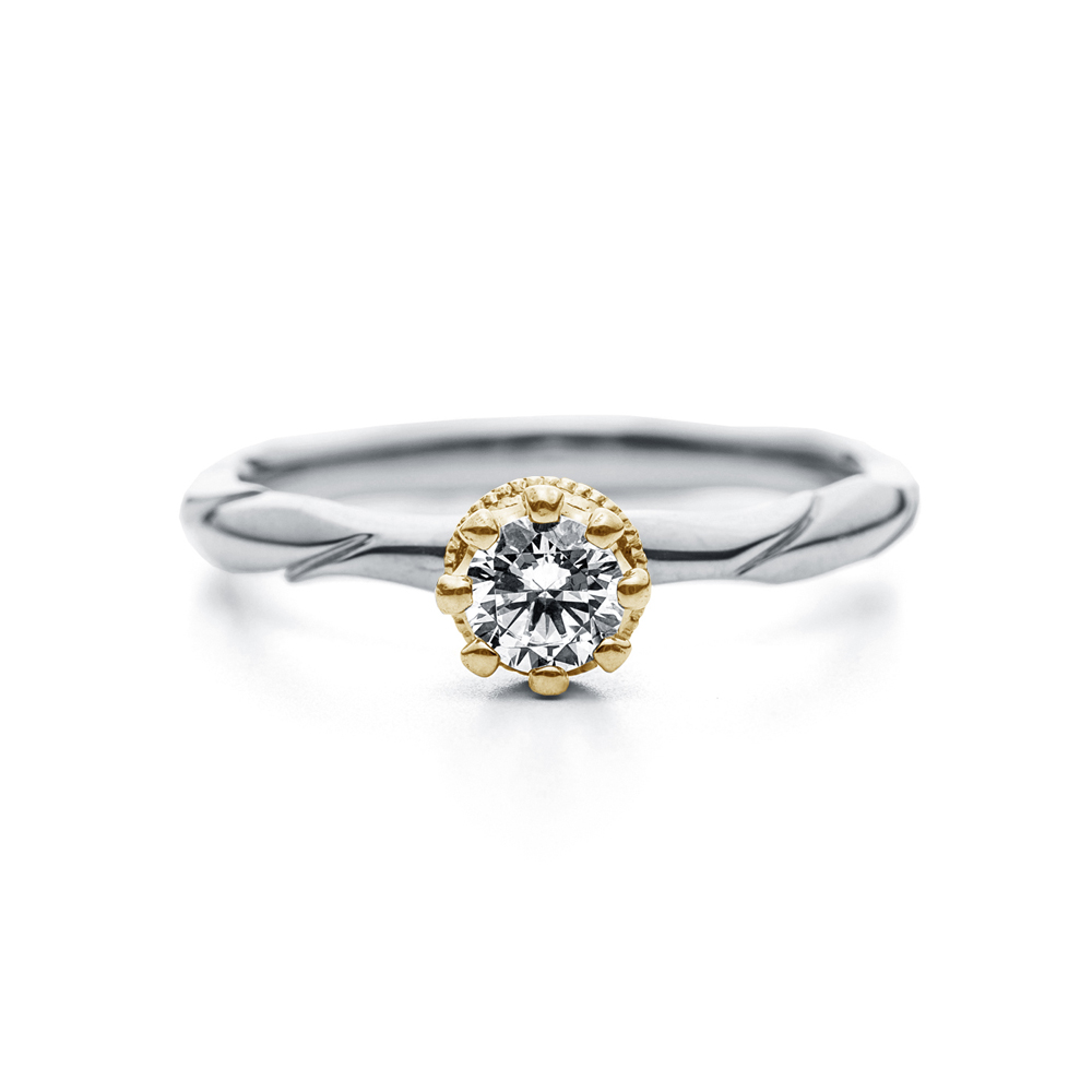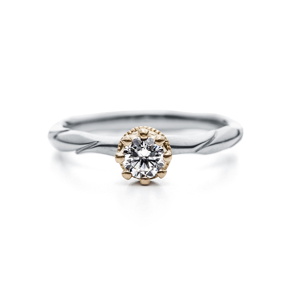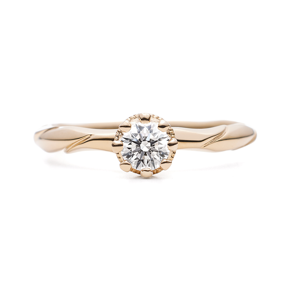 - K18シャンパンゴールドのデザインです。センターダイヤモンドは8本爪です。。爪の付け根が細く、先端に向けて太くなるミルククラウンのような特徴的な爪です。丸く象られた照り返しが横顔の可愛さをつくります。爪部分の下に段をとり、ミル打ちで一周囲んでいます。正面(センターダイヤモンド)からも下段のミル打ちが見えます。また、石枠全体を指輪の上に乗せているので重ね着けの際にピッタリと寄り添います。腕は細身のストレートライン。「葉」のつながりによる強弱が美しいフォルムです。