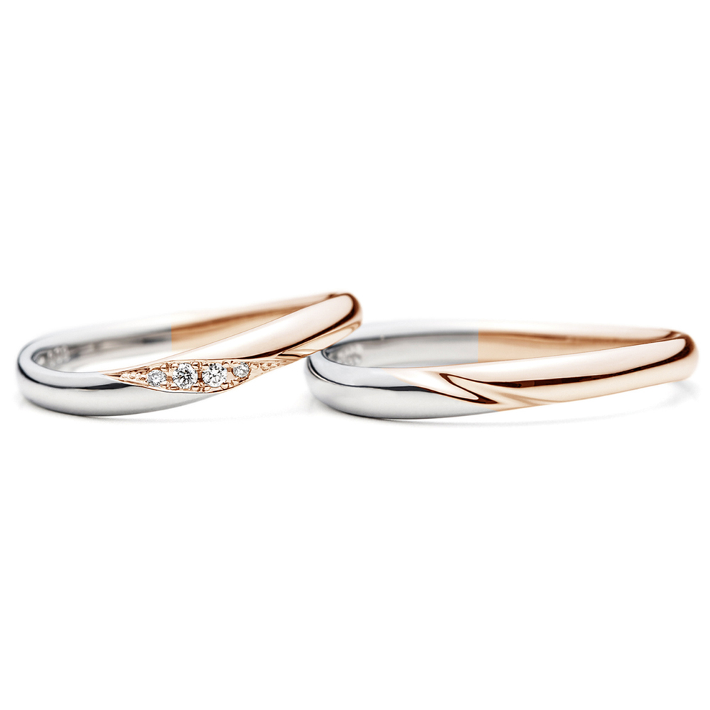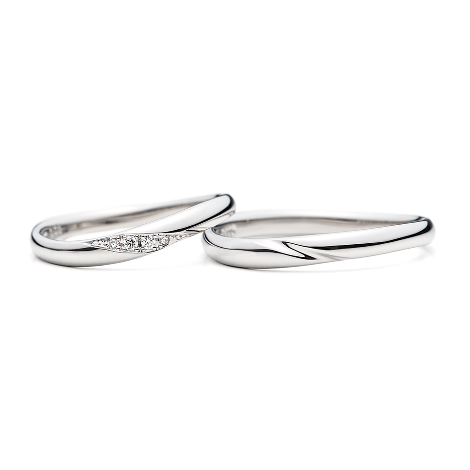 左:柔らかく大きく湾曲したS字のラインです。表面凹み部分とS字の腕は、糸が交差しているイメージを表現しています。表面は優しい甲丸で、厚みも吟味しているので指あたりの優しい着け心地です。正面にはメレダイヤモンド(0.01ct×2,0.005ct×2)を凹み部分に留めているので、メレダイヤモンドの当たりが気になりません。見た目にも気持ちの良い、少し華やかなシンプルデザインです。