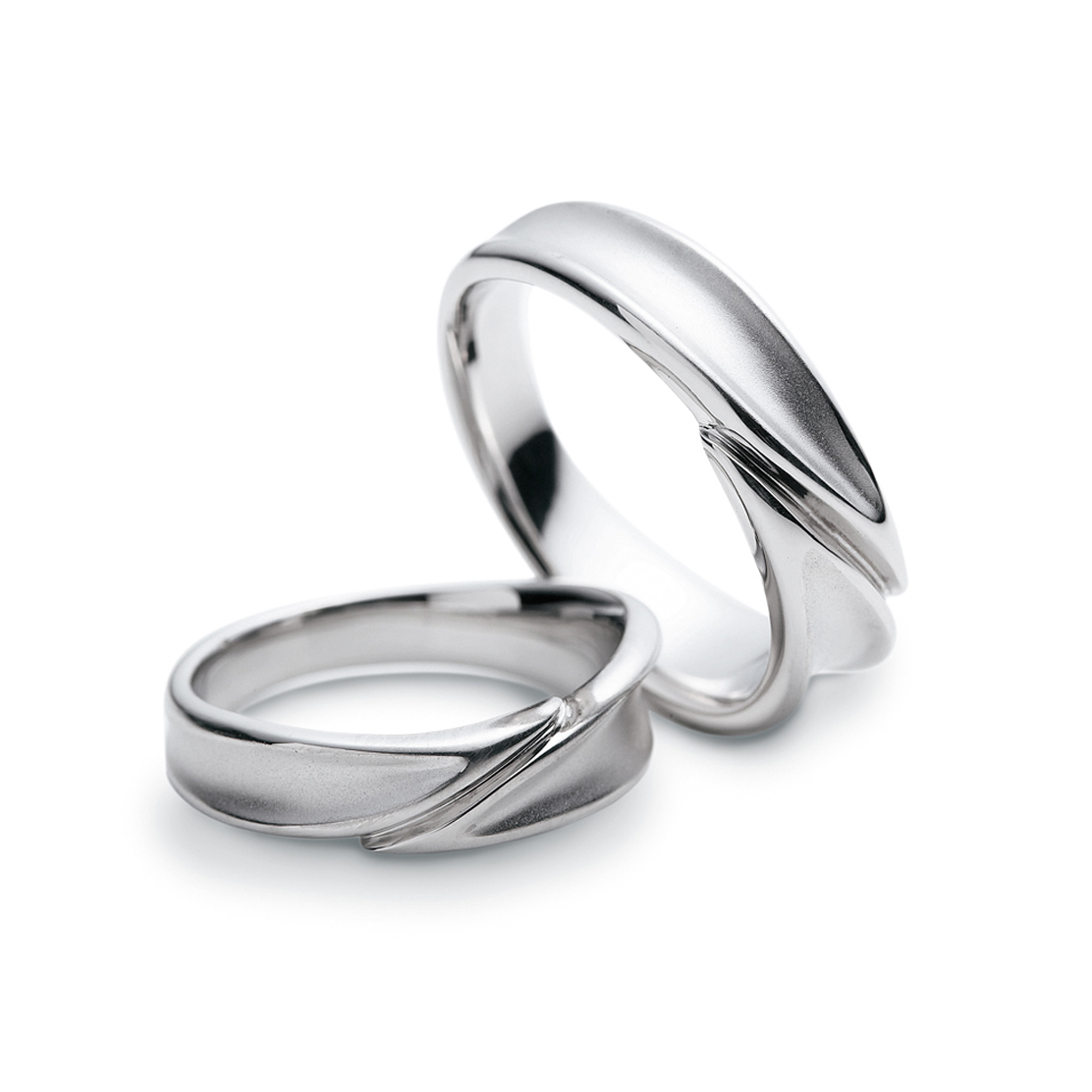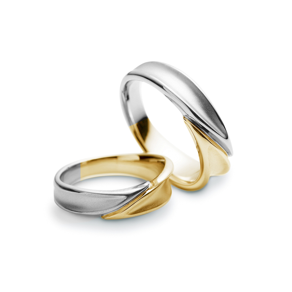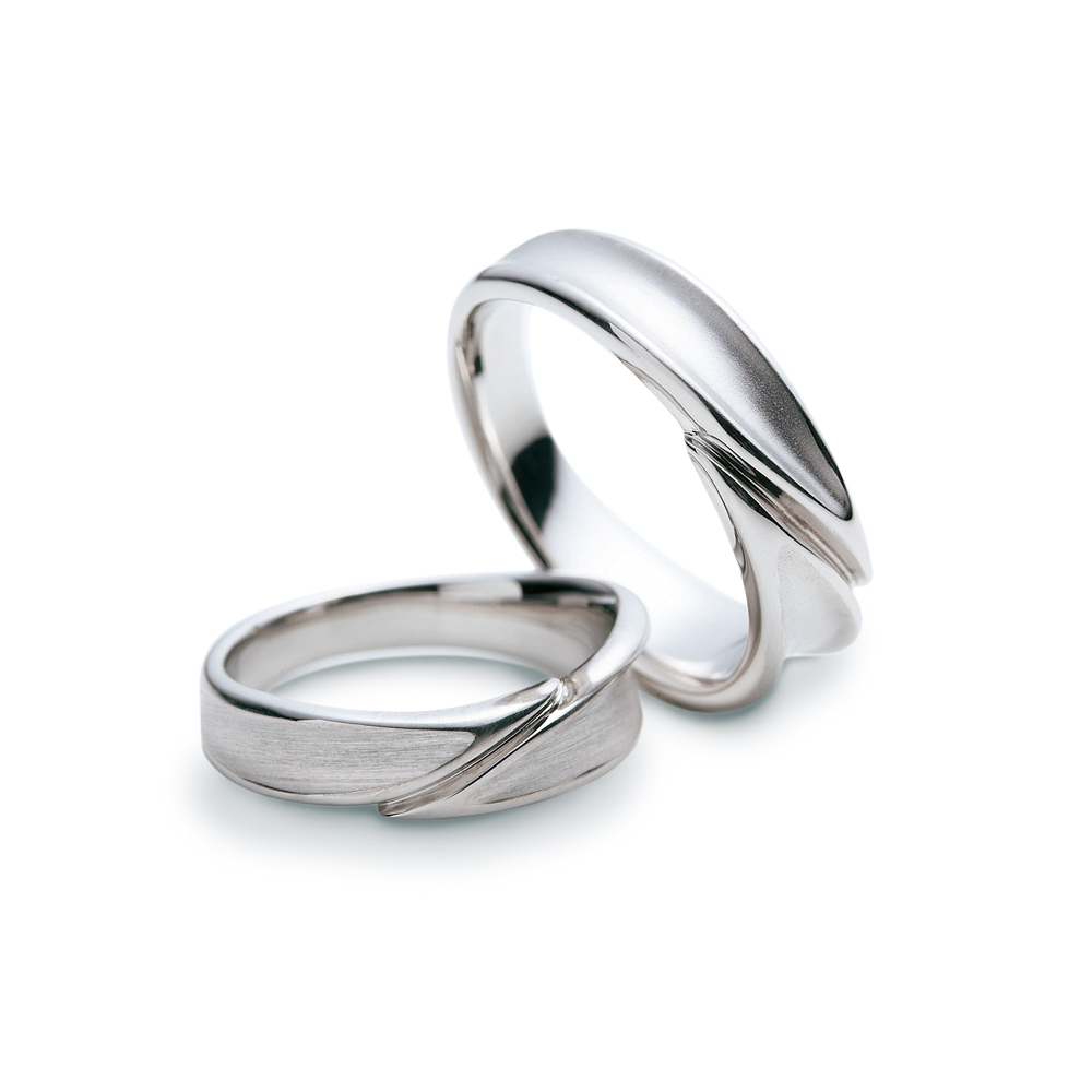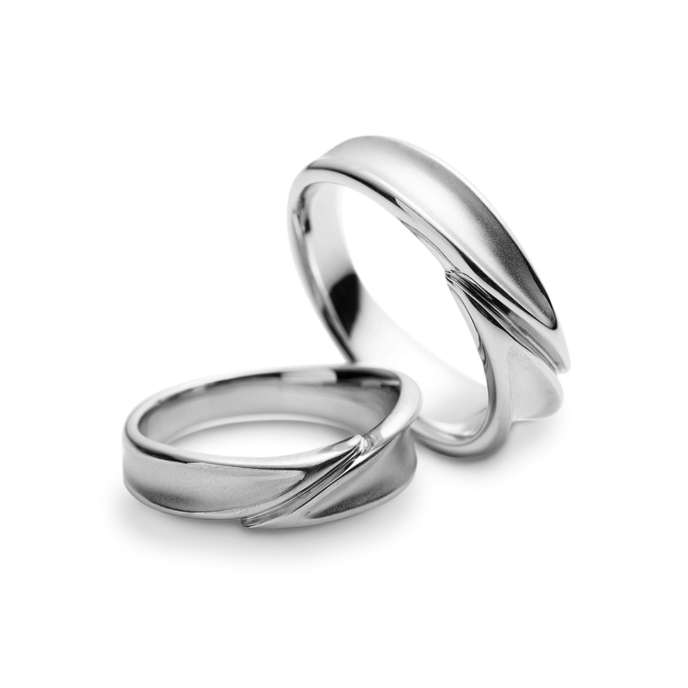 幅広の指輪を左右に抱き合わせにデザインしています。左右のボリュームに変化を付け、非対称にする事で指輪に躍動感があります。また表面の凹みにより、より一層葉を連想できるスタイルです。凹み部分はサンドブラスト仕上げ、輪郭をグロス仕上げにしているので、すっきりとした印象になり、視覚的にデザインを認識しやすい指輪です。