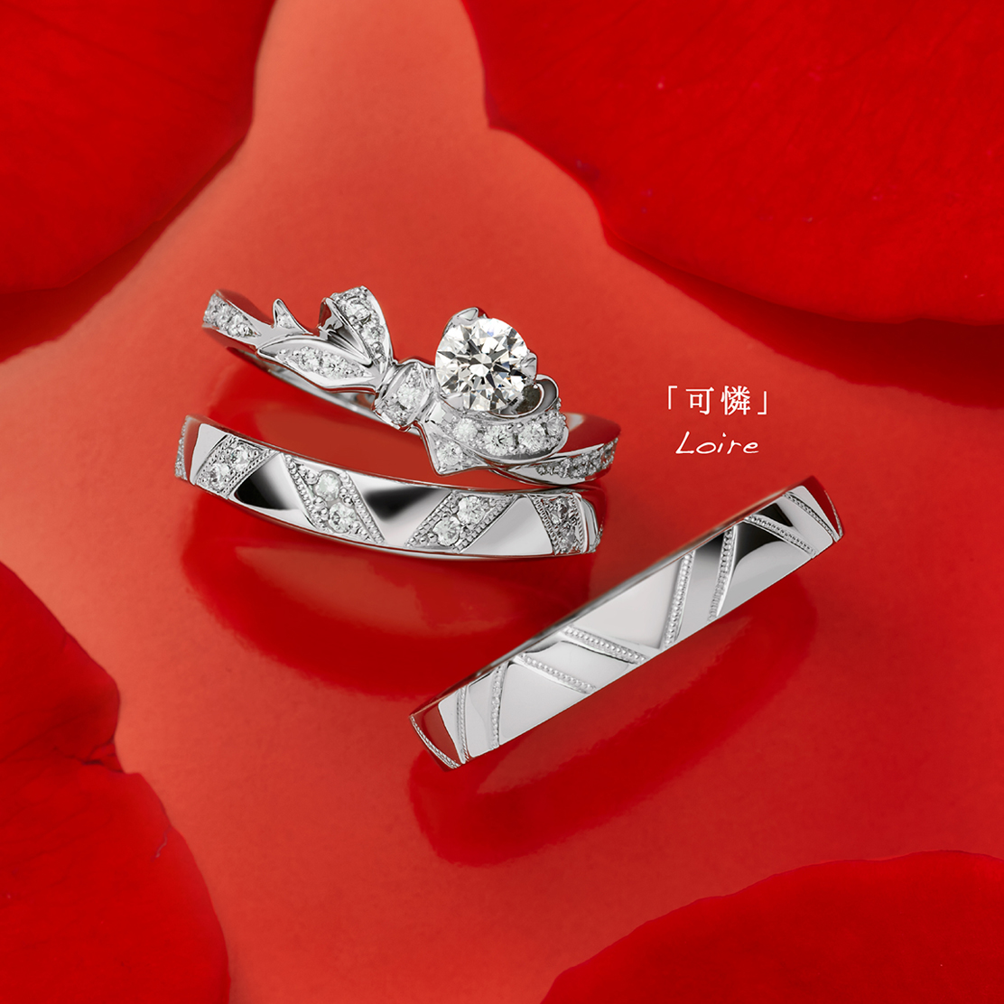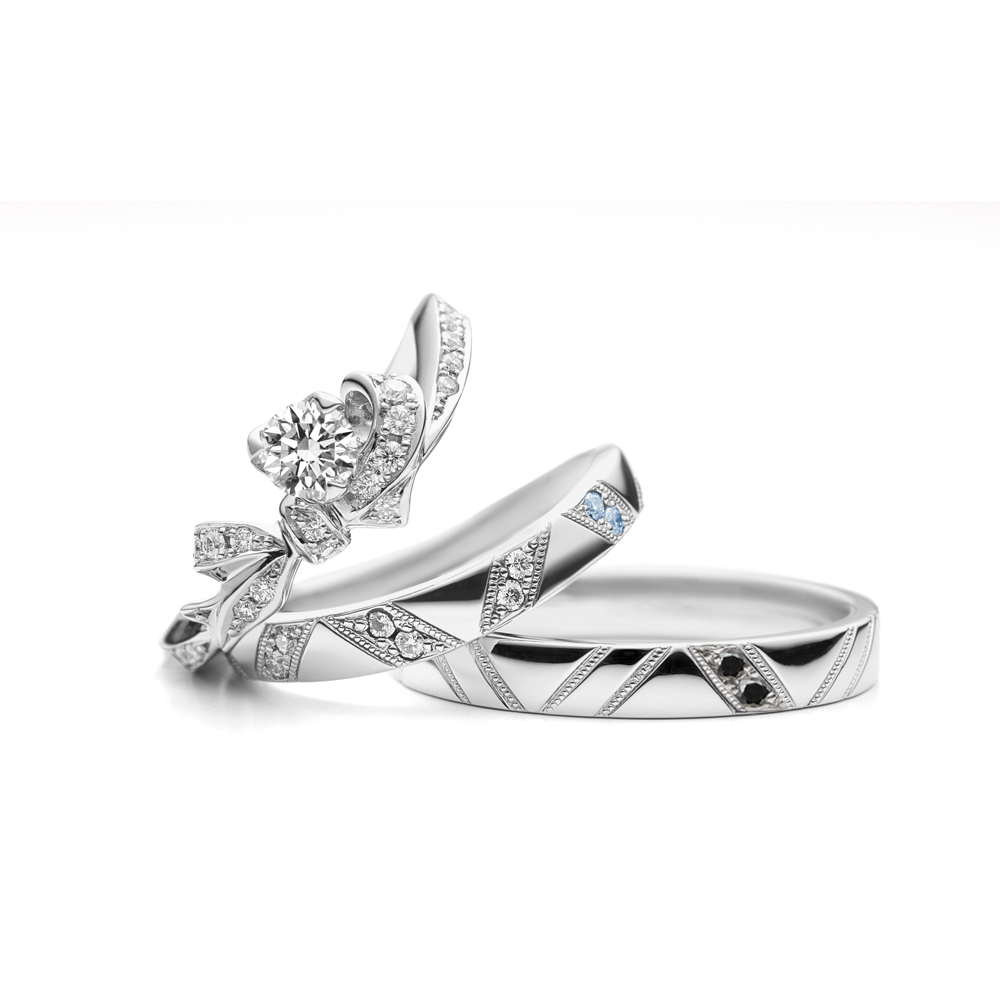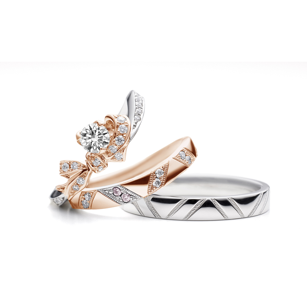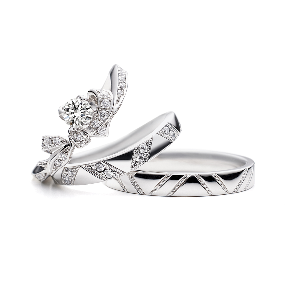 婚約指輪:センターダイヤモンドは3本爪です。です。リボンを象った指輪に少し首をかしげた様なイメージの留め方が可愛い表情をつくっています。甘すぎず、どこかキリッと引き締まったイメージです。流れるようなラインと、クルクルとしたパーツがリボンらしさを演出しています。また、メレダイヤモンド(0.01ct×12, 0.005ct×12)を全体に留めており、見た目にも豪華な指輪です。