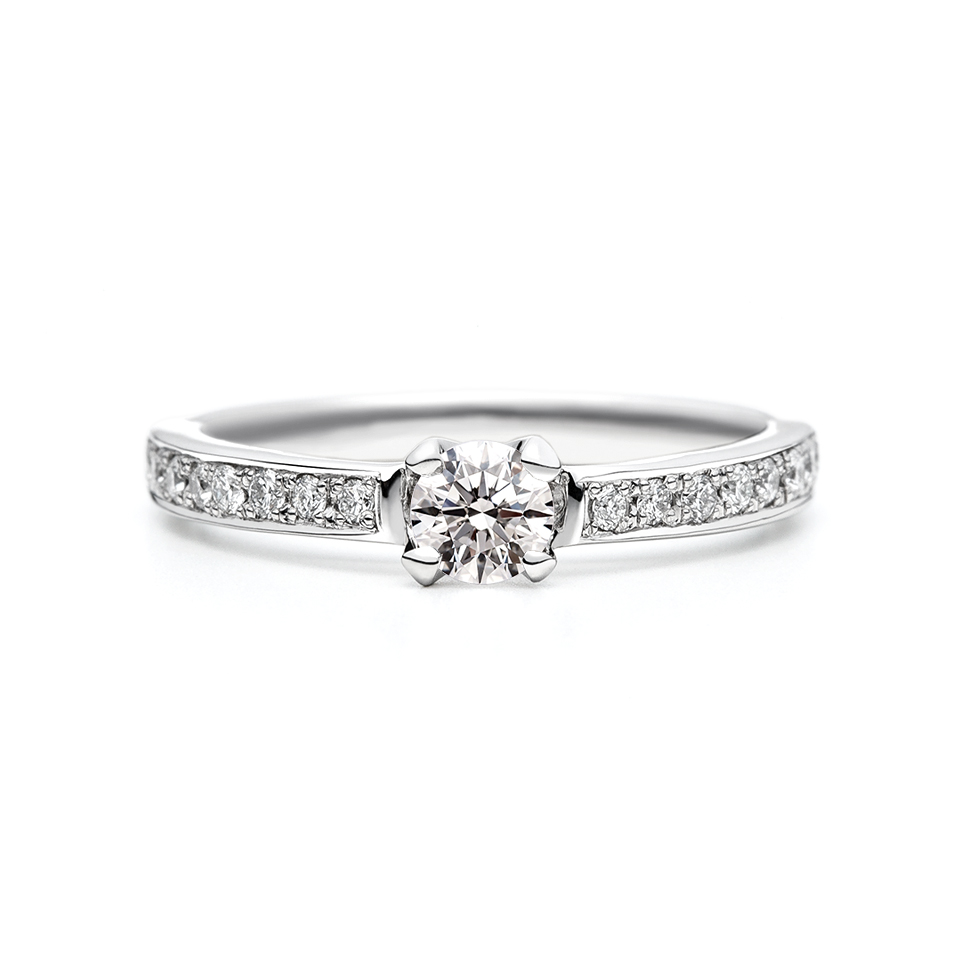 - センターダイヤモンドは4本爪です。です。センター石枠は照り返しを深くし、ダイヤの側面まで見せ、光をより多く取り込めるようにデザインしています。センターダイヤモンドの両サイドにメレダイヤモンド(0.01ct×16)を8ピースずつ留めています。腕は側面から見るとセンターダイヤモンド手前から分かれ、高さを出しており、側面からの眺めも美しいです。