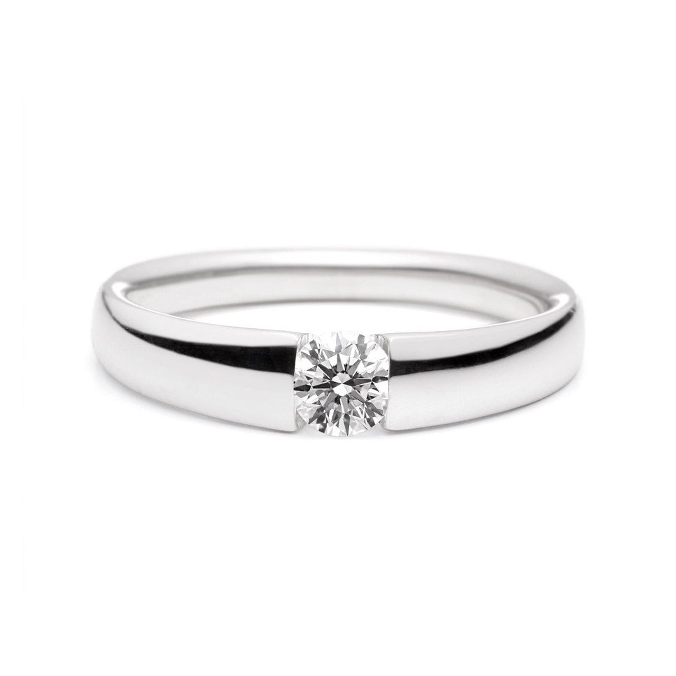 - センターダイヤモンドのセッティングは爪の無い左右からの伏せ込み留めです。爪による引っかかりがなく、厚みを極力抑えたボリュームなので、結婚指輪感覚で着けられます。側面からの内側まで斜面を大きくとり着け心地を良くし、見た目にもすっきりした印象に仕上げています。また、斜面をつけた側面にメレダイヤモンド(0.005ct×1)を留めています。着けた時に自分からしか見えない秘密のお守りをイメージしています。指輪のシルエットは正面から手のひら側に向けて幅が細く絞れていきます。着け心地は細身の指輪と変わらない心地よさです。