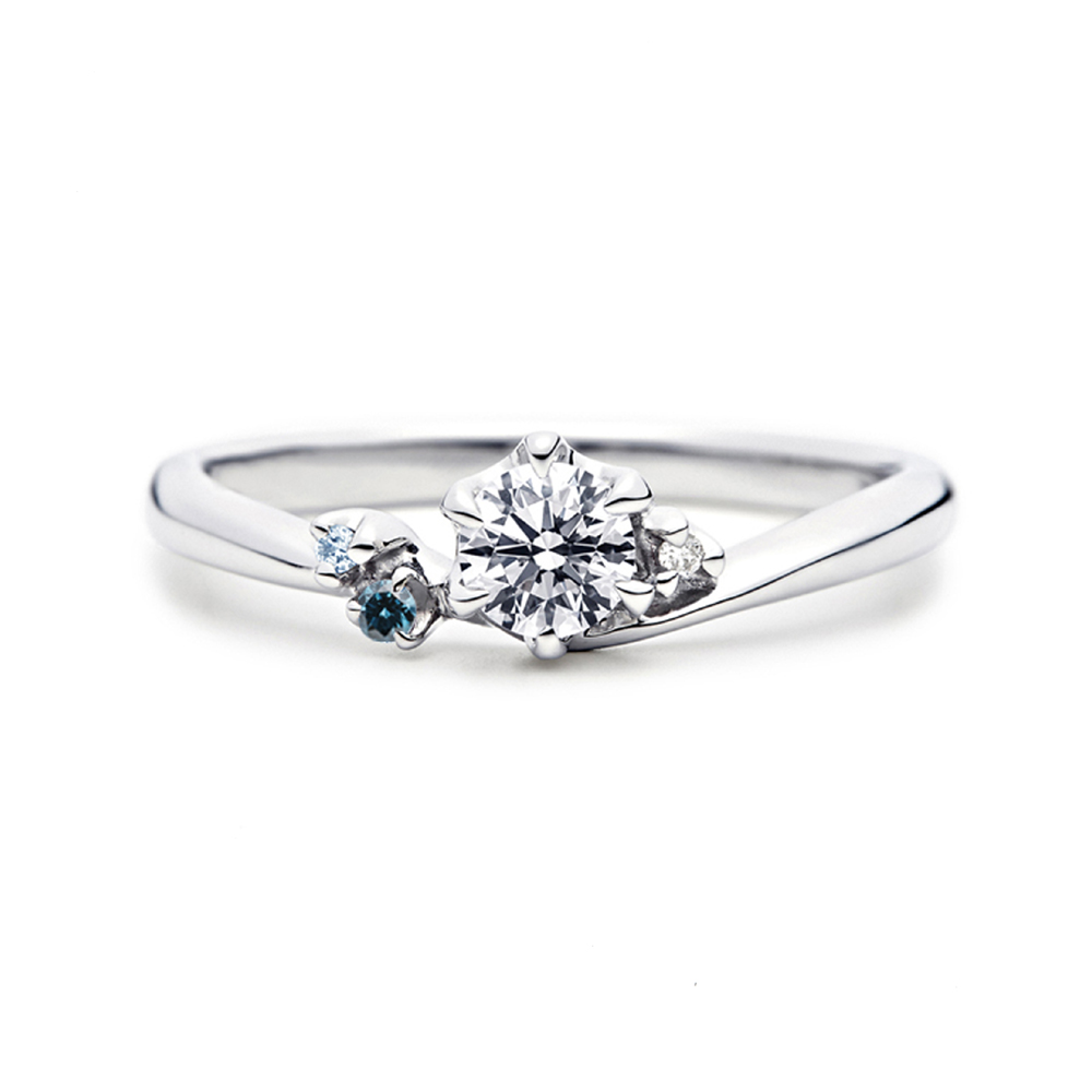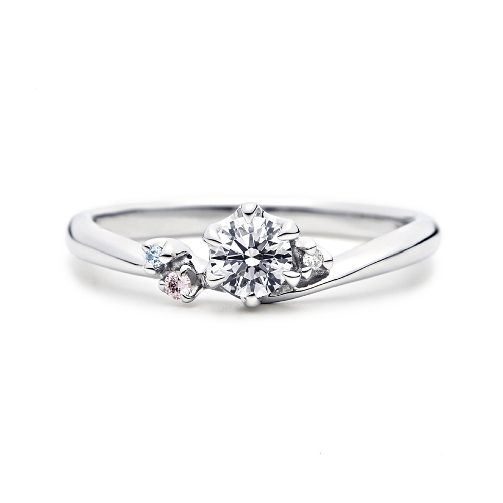 - 緩やかなU字のウェーブライン。センターダイヤは6本爪。センターダイヤの右側にホワイトダイヤ(0.005ct×1)、左側にピンクダイヤ(0.01ct)とホワイトダイヤ(0.005ct)を3本の爪留めにて配置しています。アシンメトリーの美しさとピンクダイヤのフェミニンな雰囲気が印象的です。