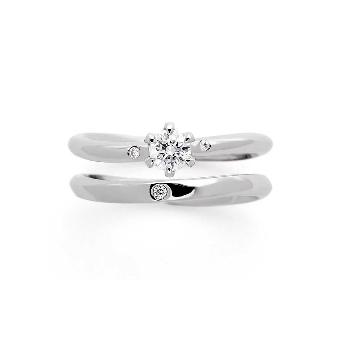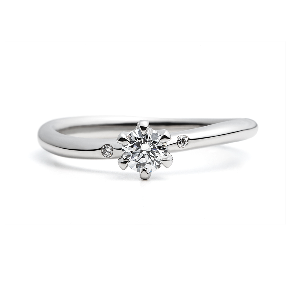 - センターダイヤモンドはシンプルで丸みを帯びた6本爪でセッティング。 両サイドにメレダイヤ(0.005ct×2)が伏せ込みで留められています。これによりメレダイヤの輝きとプラチナの光沢が合わさり、センターダイヤモンドが美しく映えます。メレダイヤはおふたりの心を表し、指輪全体の柔らかなウェーブは幸せな気持ちが舞う様を表現しています。