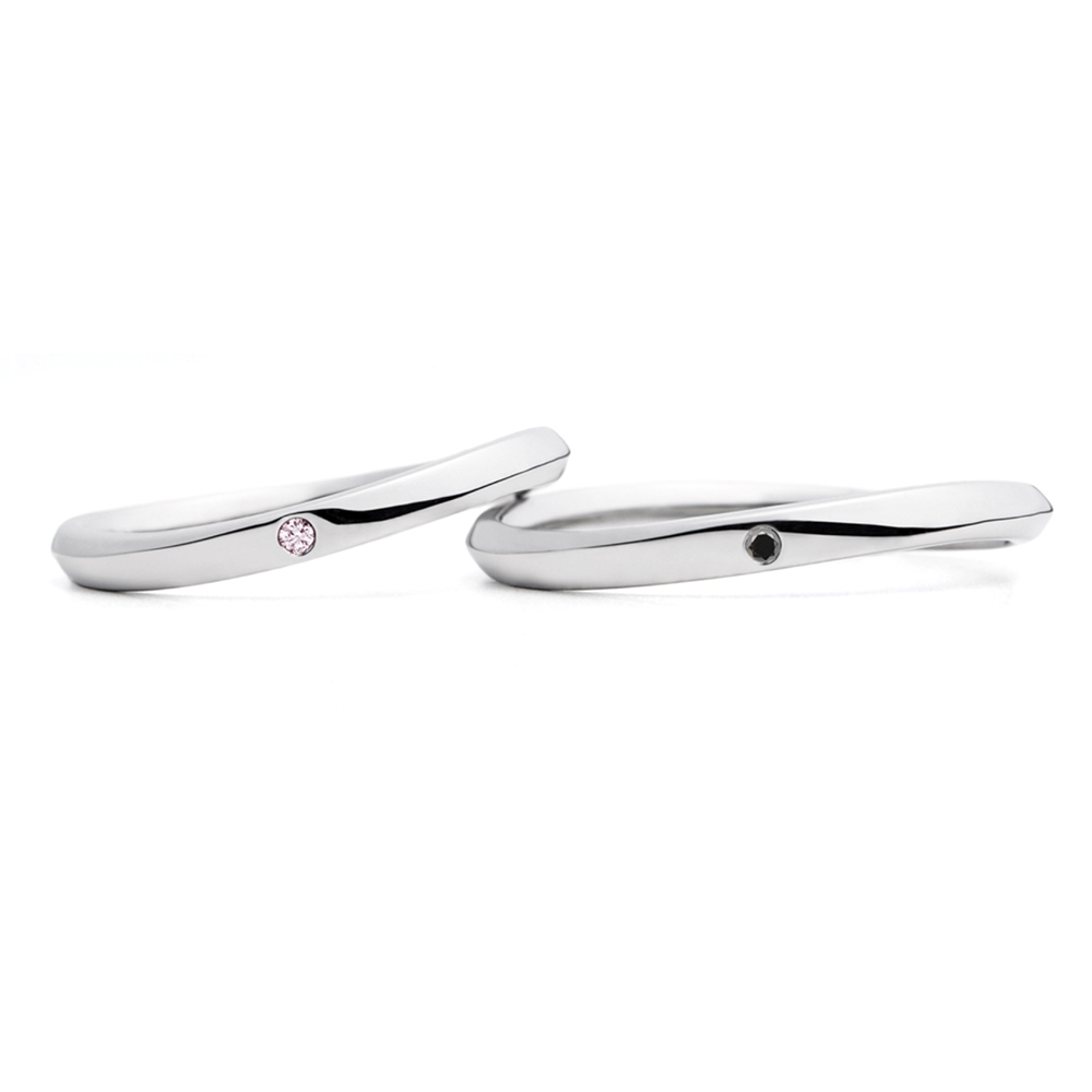 - 左:ゆるやかに流れる面は”舞”本来が持つ"旋回”という意味からメレダイヤモンド(0.01ct)を中心に左右の面が美しく円を描いています。少しシャープさを持ったフォルムにメレダイヤモンドを伏せ込む事で凛とした空気感を表現しています。