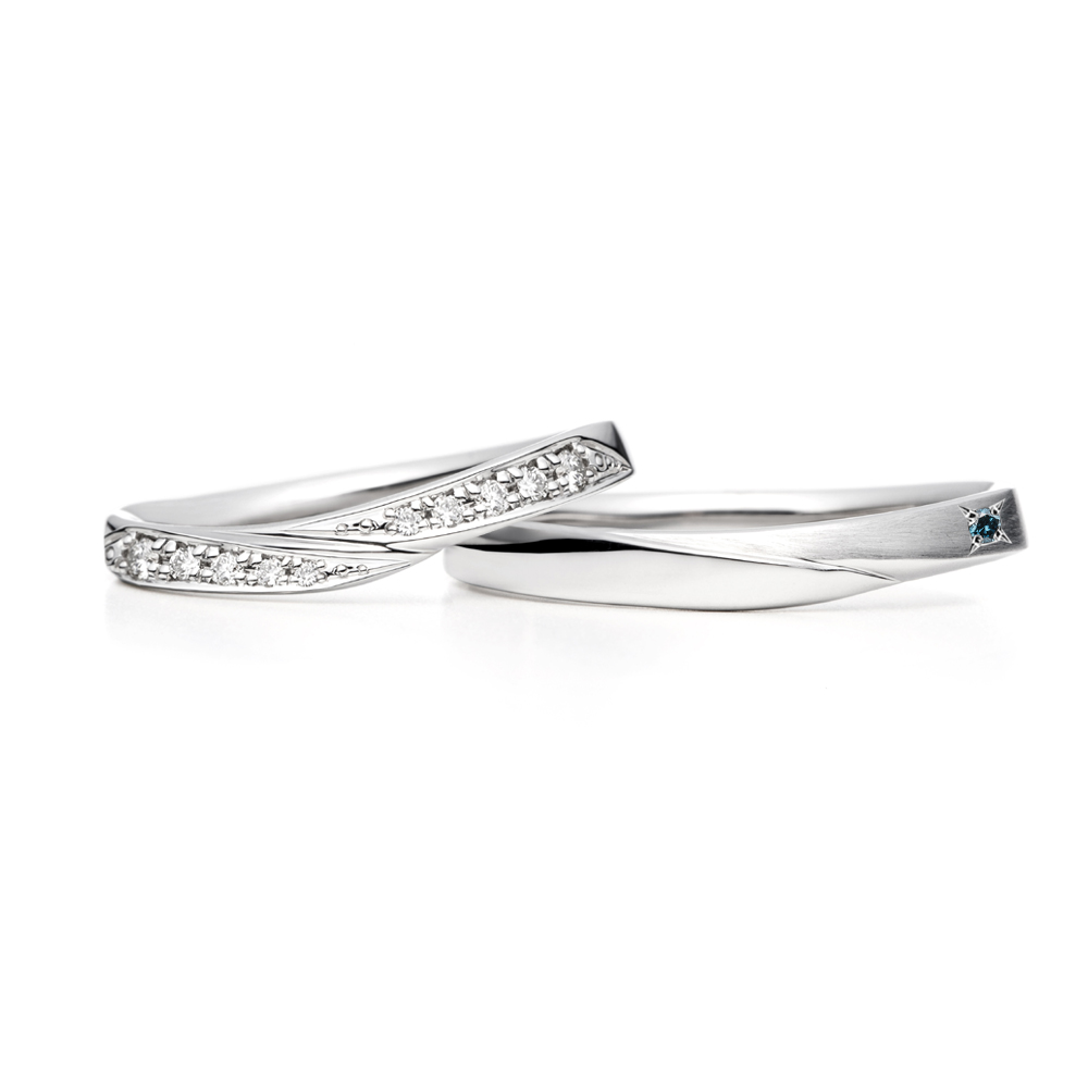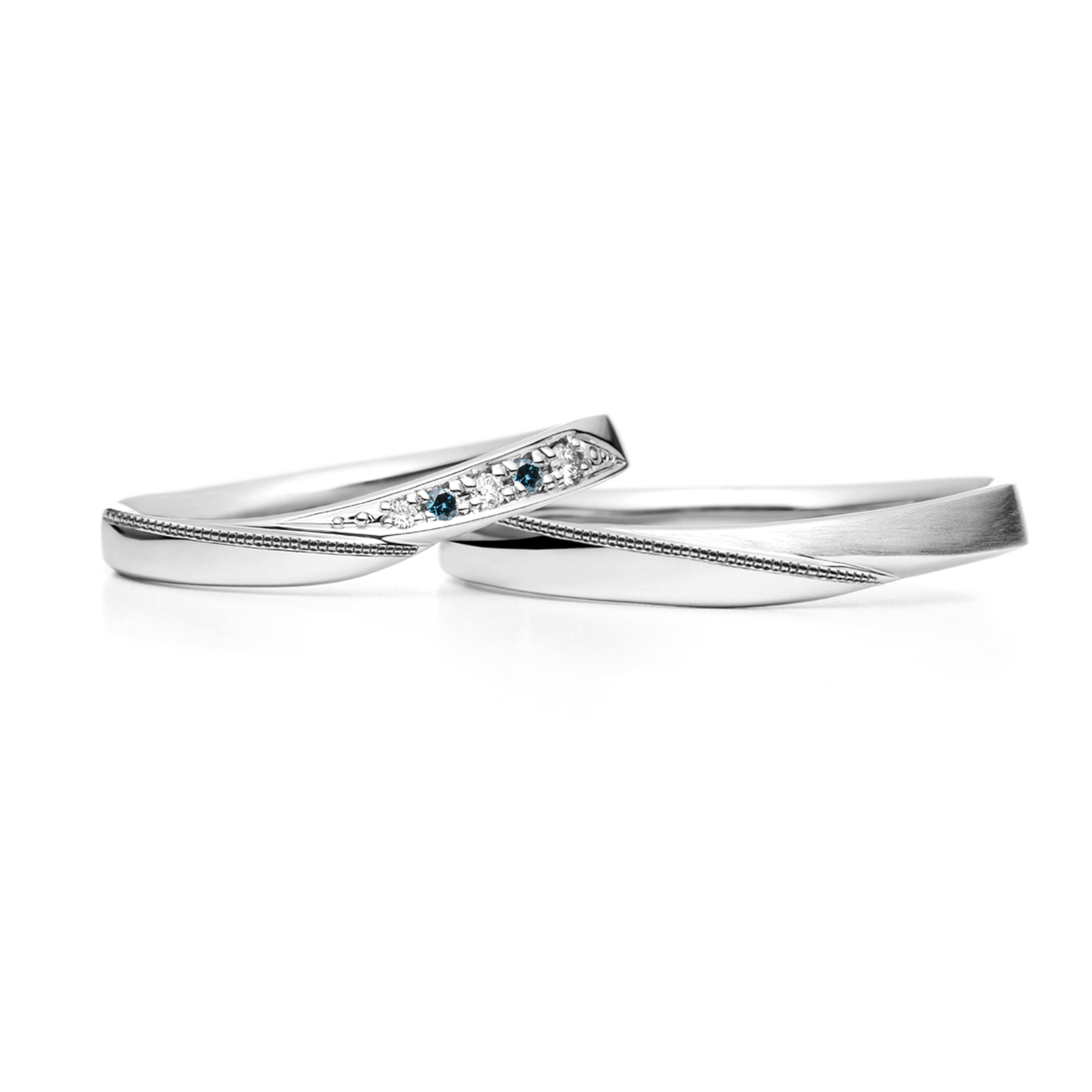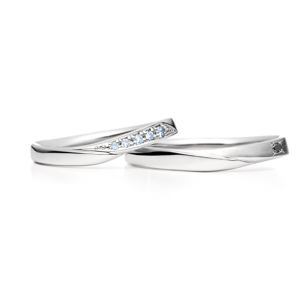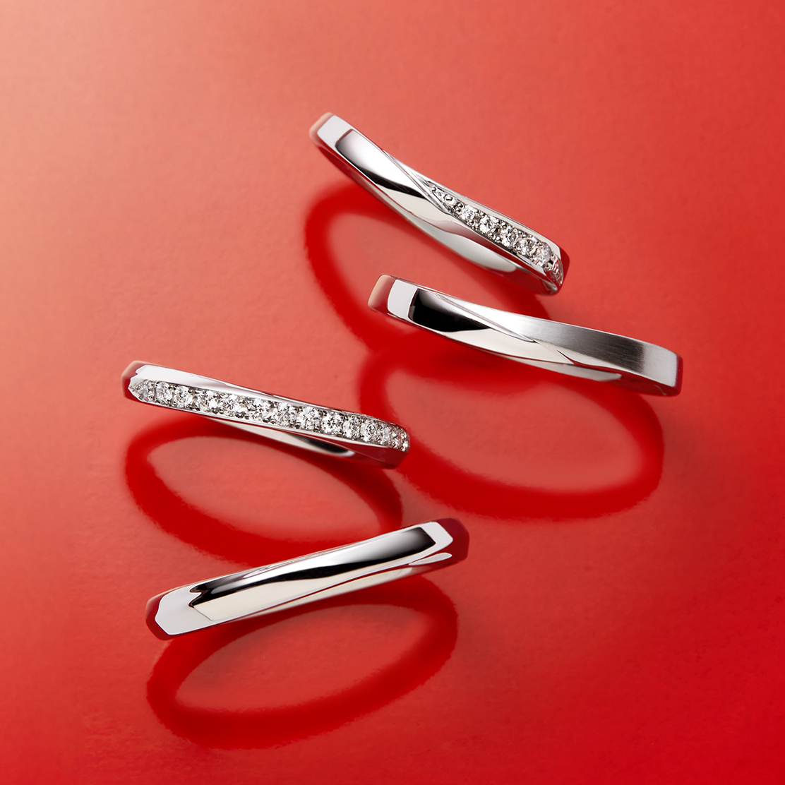 - 左:婚約指輪と隙間が空くことなく綺麗に重なります。平甲丸の優しいV字ラインは航路を優雅に進む船体の正面を連想させます。指当たり、着け心地もよくすっきりとした存在感があります。メレダイヤモンド(0.005ct×1,0.0066ct×1,0.01ct×2,0.014ct×1)は船が進む時に生まれる水しぶきをデザインしています。着けた時に中指側に流れるように留めているので清楚な印象です。どの角度から見ても美しく見えるようにすっきりと留め終わりを斜めにカットしています。