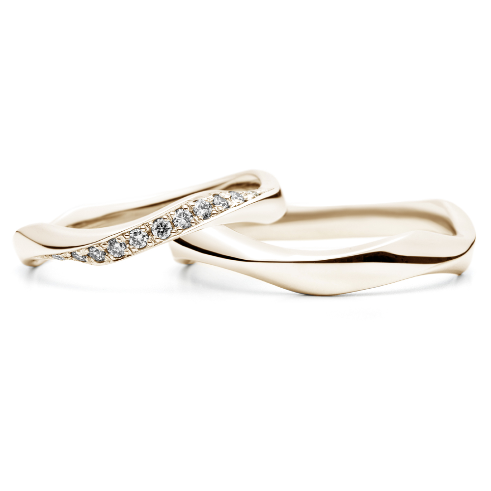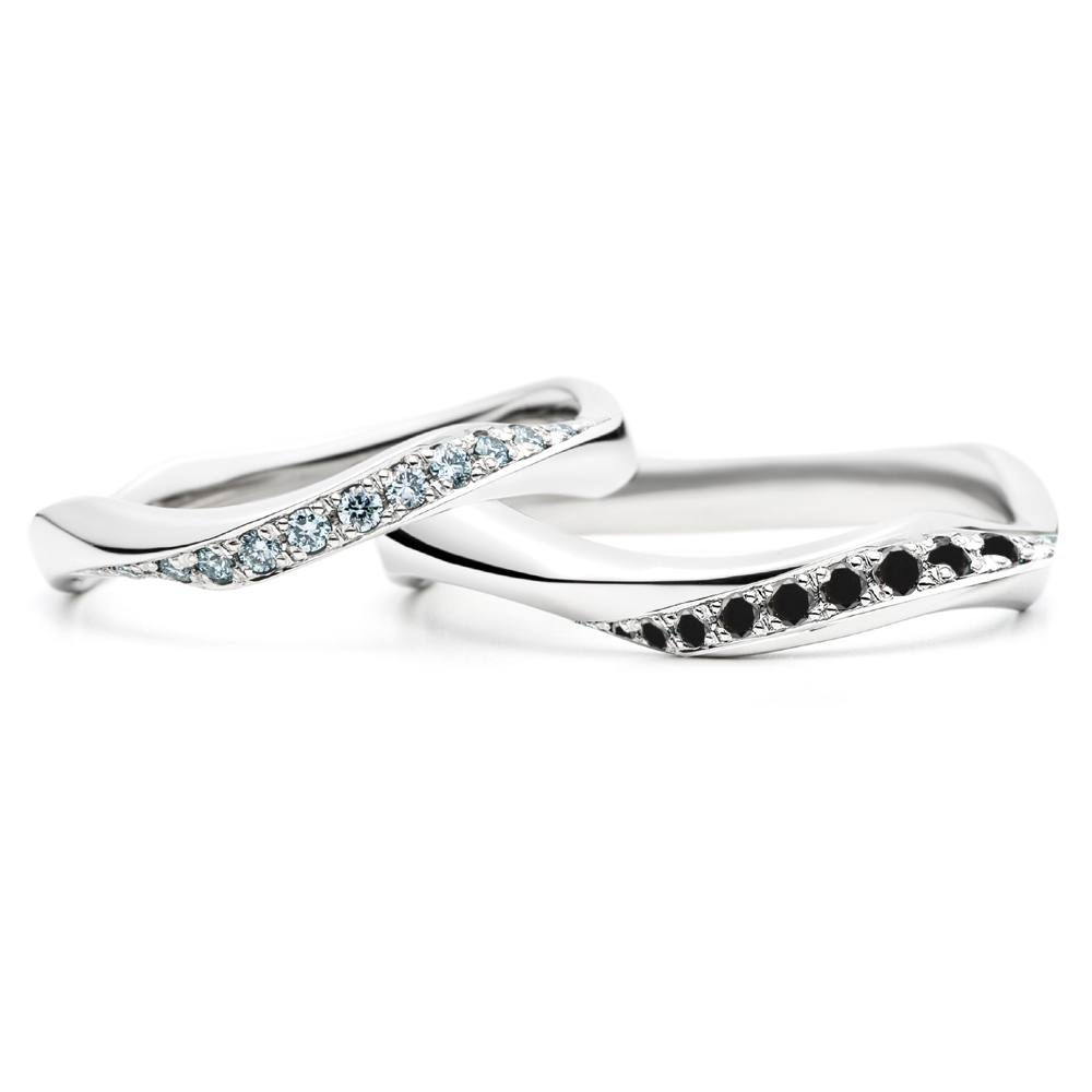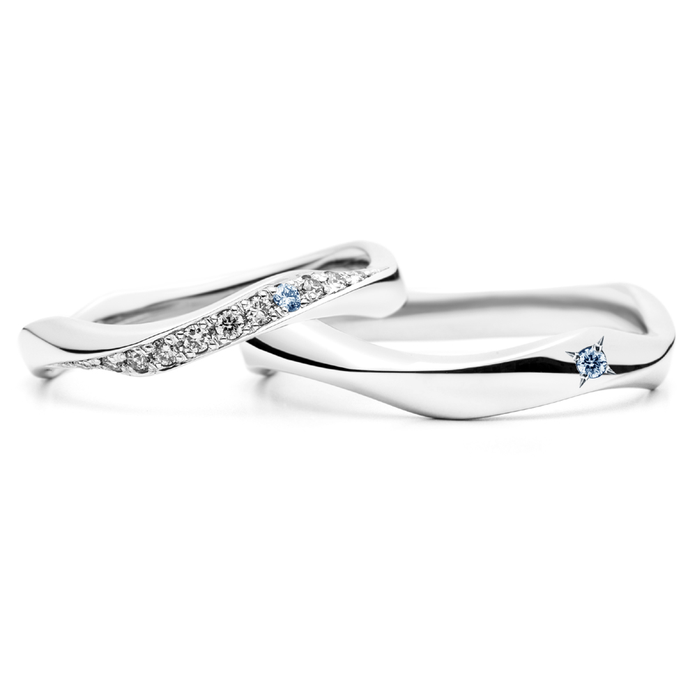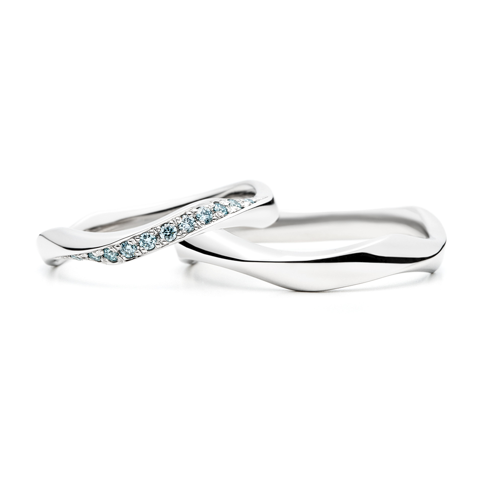 - 左:婚約指輪と同様に立体感のあるひねりとカーブで構成した美しいデザインです。正面にアイスブルーダイヤモンドモンド(0.01ct×9, 0.005ct×2)が並びます。こちらもダイヤモンドが指輪側面まで巻き込むデザインなので、様々な角度から輝きを楽しめます。