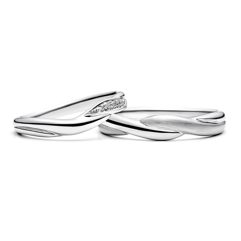 右:結婚指輪(左)のウェーブと比べ全体のイメージがストレートのフォルムです。2本のウェーブラインの片側がグロス仕上げ、もう片方がヘアーライン仕上げのコンビネーションに仕上げており、より重なりが強調されています。