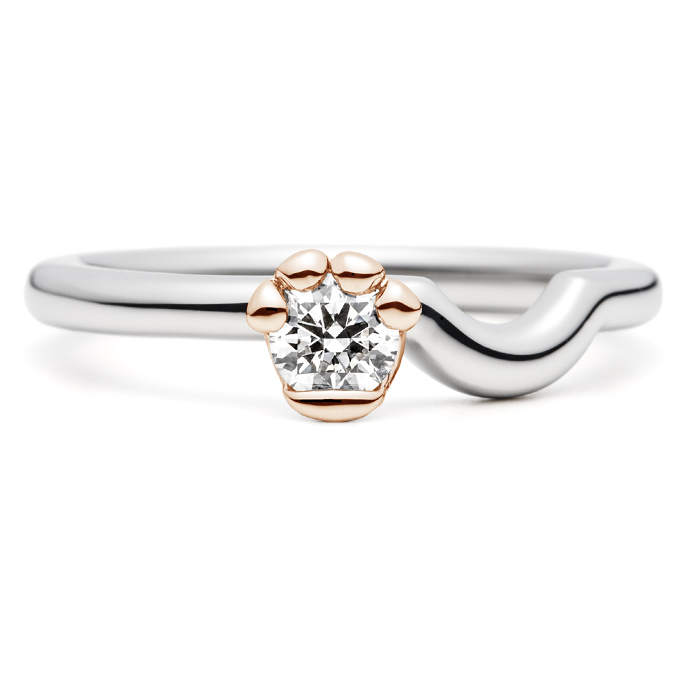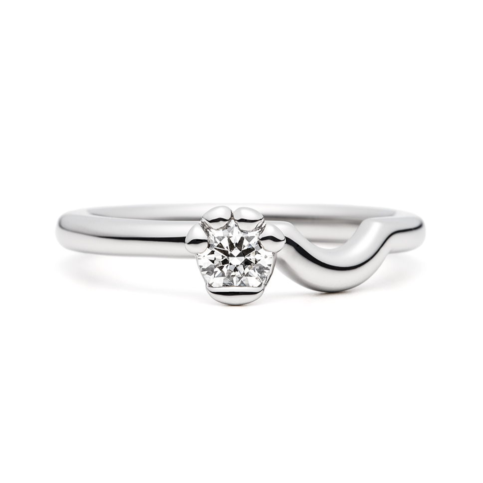 U字部分を正面にしてダイヤモンドが小指側に寄った状態で着けるデザインです。正面のU 字部分はネコの顔下半分となり、結婚指輪(ネコ耳) と重ねてネコの顔が正面に現れる仕組みです。ネコの手(肉球) でダイヤモンドを掴んでいる様子をイメージしてセッティングする肉球留めが特徴的です。爪はぷっくり丸く、石枠を横から見ても愛らしい印象になるように工夫しています。モチーフがカジュアルな印象ですが高級感や上質感を感じられるよう指輪全体のボリューム感とフォルムに拘りました。