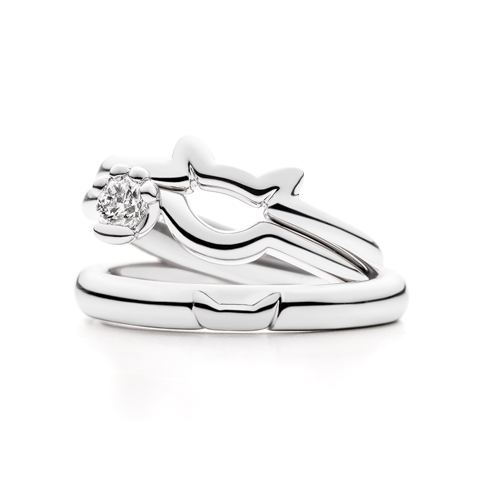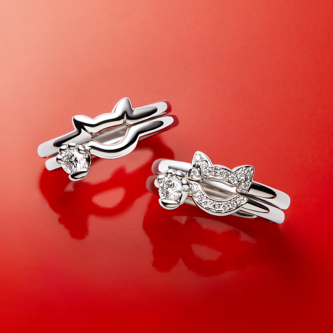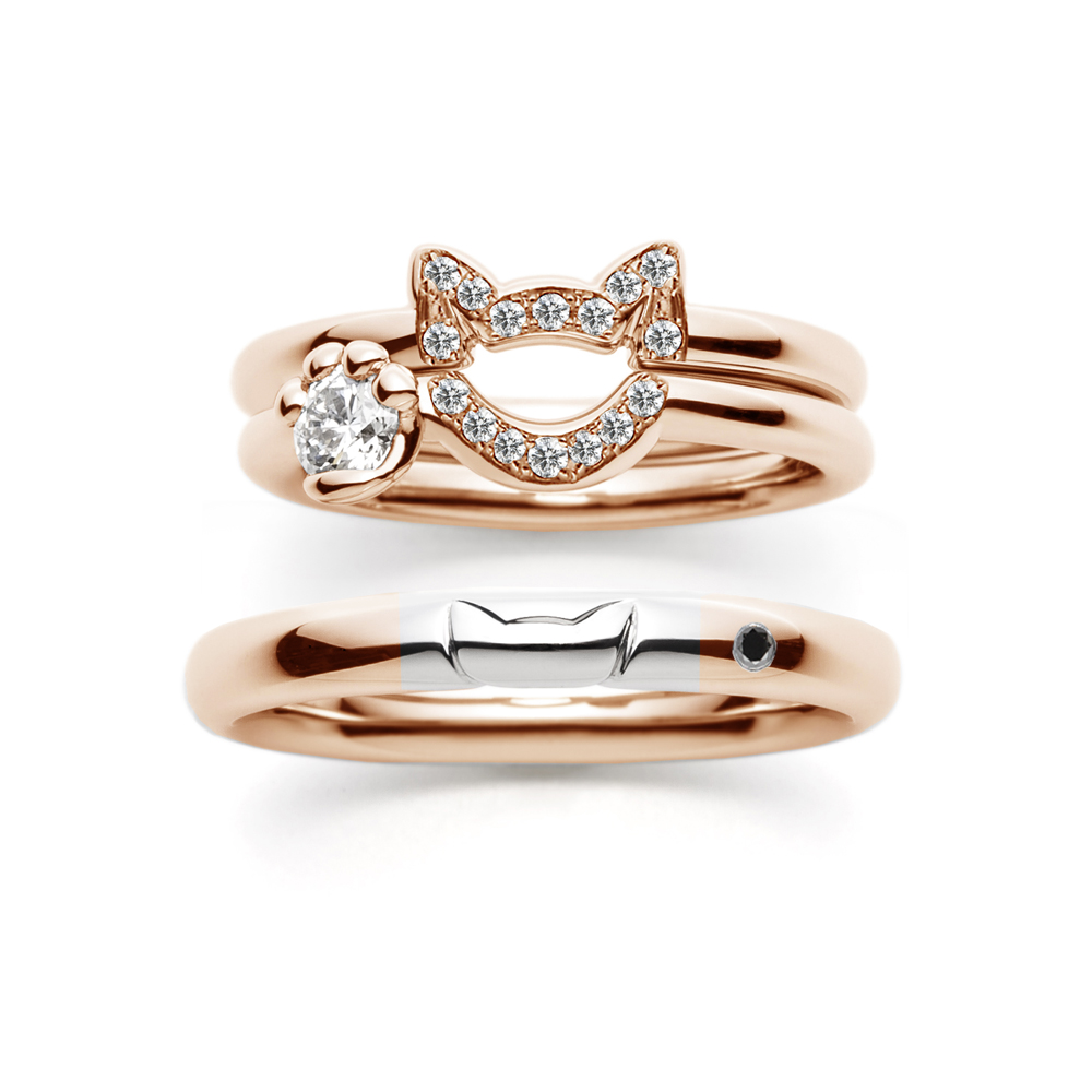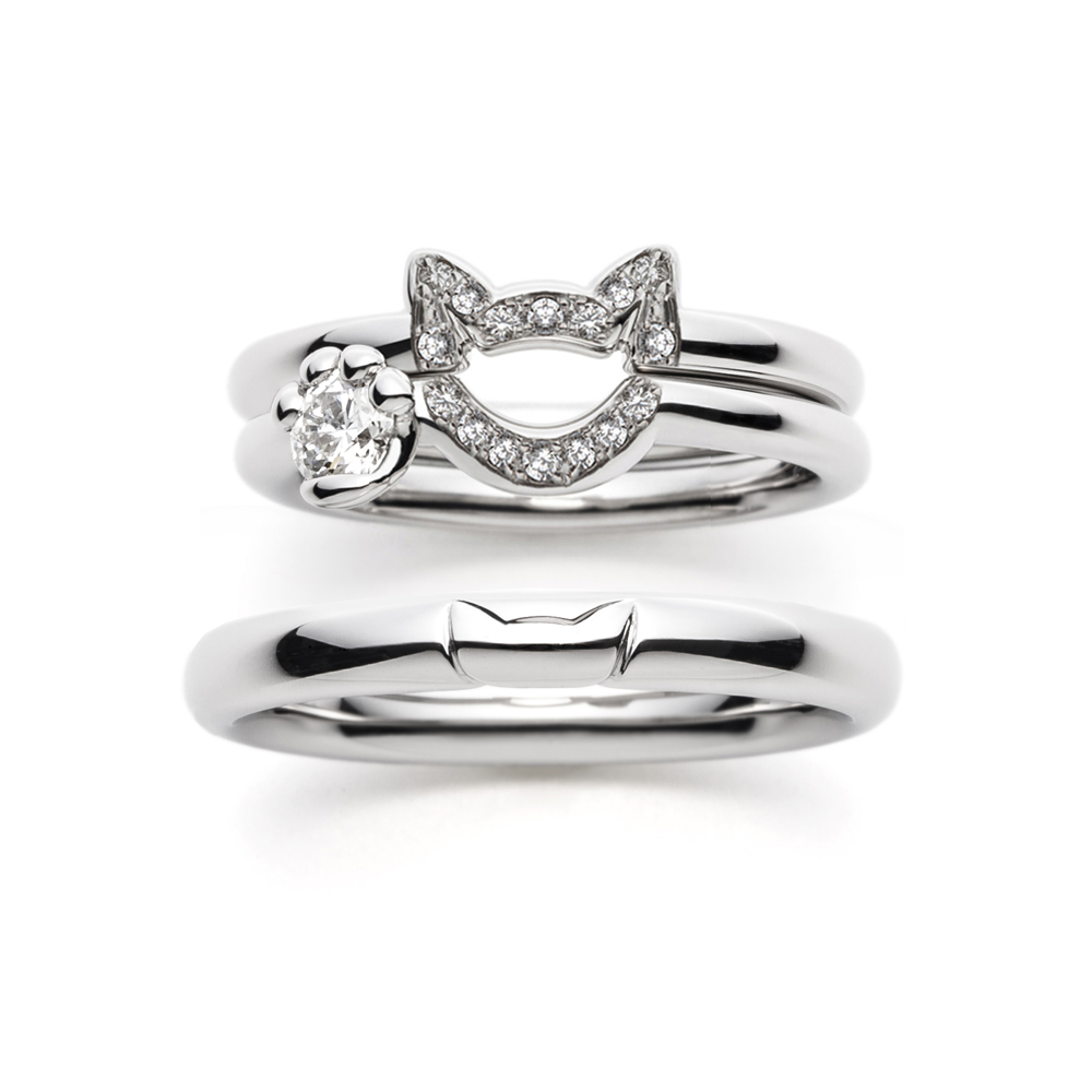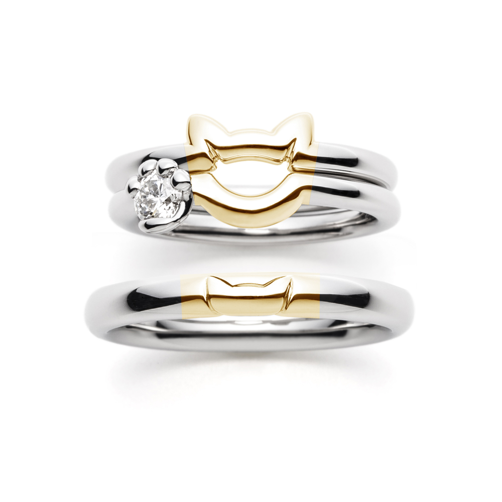 - 婚約指輪と結婚指輪(ネコ耳)を重ねてネコの顔になるデザインです。ポイントは結婚指輪(ネコ耳)が上、婚約指輪を下に重ねて着ける事です。
