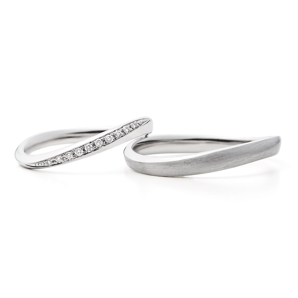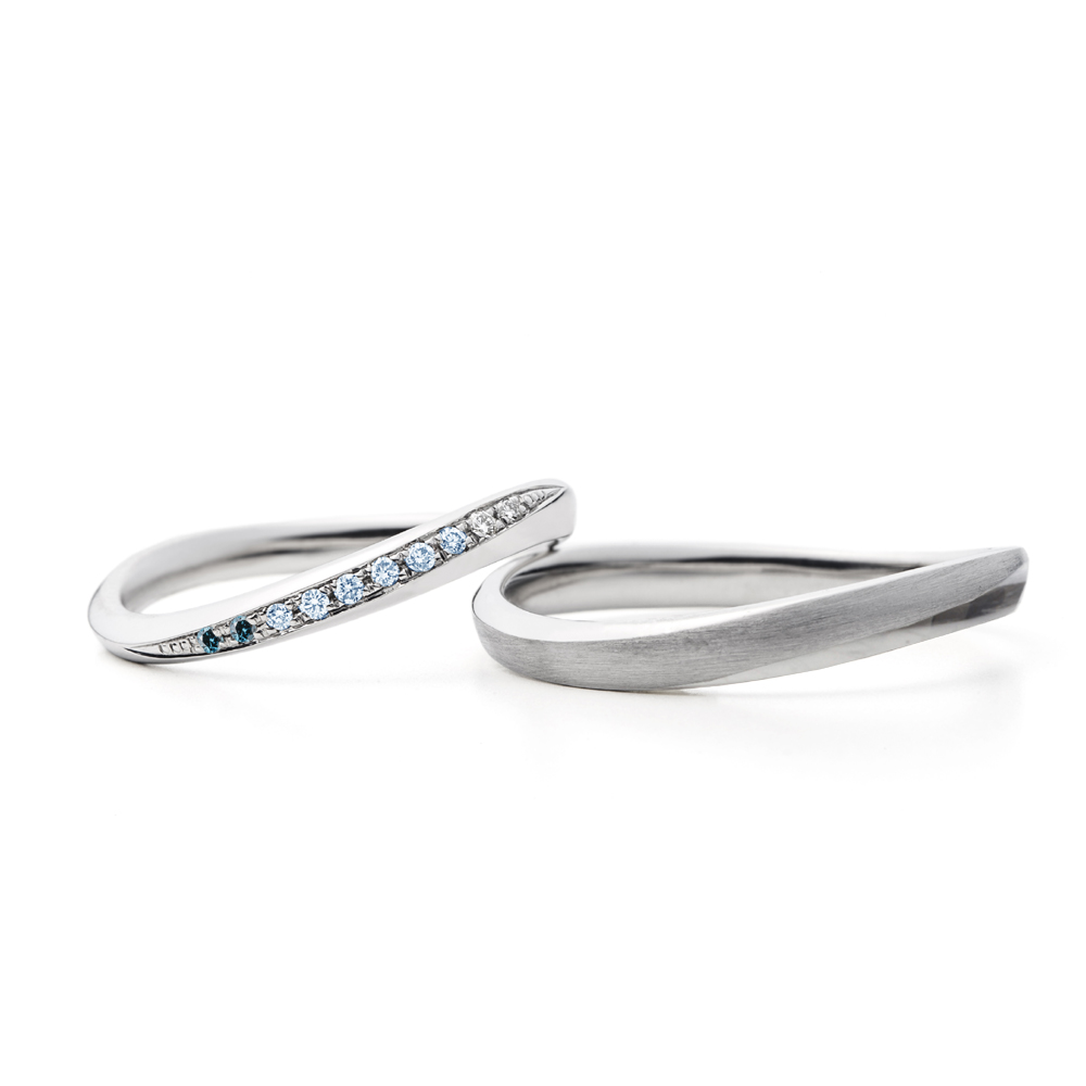 左:メレダイヤモンド(0.005ct×10)を留めて婚約指輪と同様に水しぶきをイメージしています。指輪の形状は無限の形を基本として、左側を少しシェイプし自然な流れを創り出しています。重ね着けすると最高の組み合わせです。