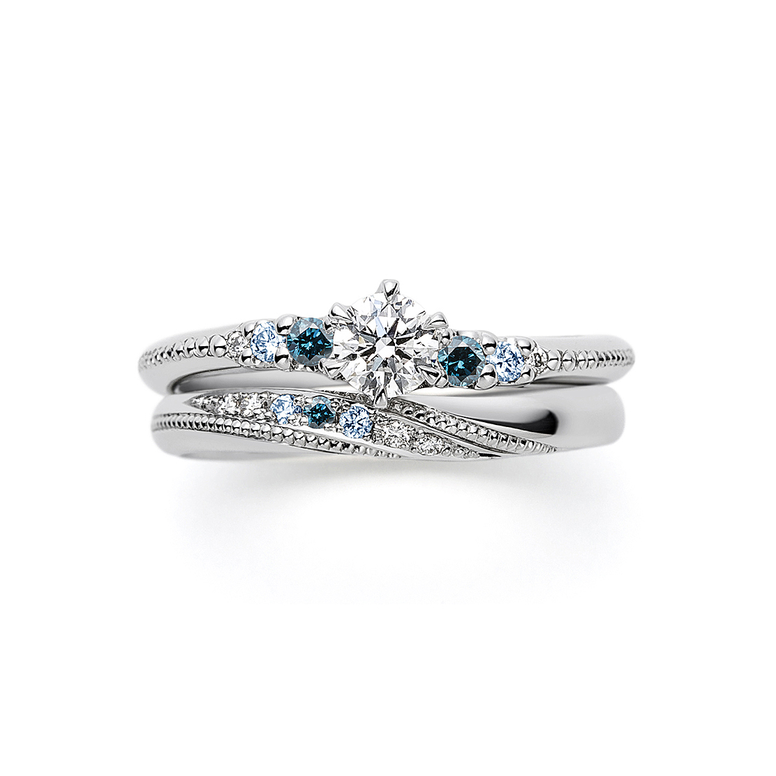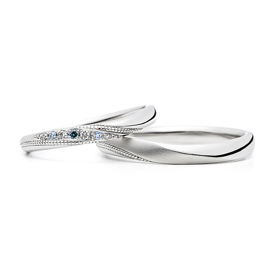- 左:婚約指輪とぴったり重なり、天の川に輝く星々を7石のメレダイヤモンド(0.005ct×4,0.01ct×3)とミル打ち(#7)で表現しています。独特なウェーブは着ける人の手を選ばないフィット感があります。大人の女性らしい甘さのある仕上がりです。