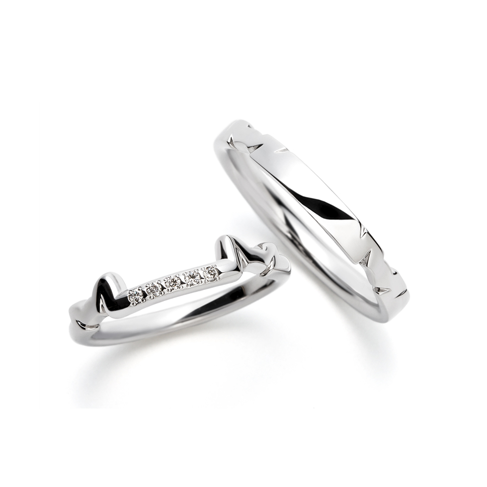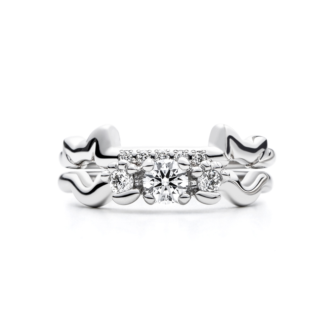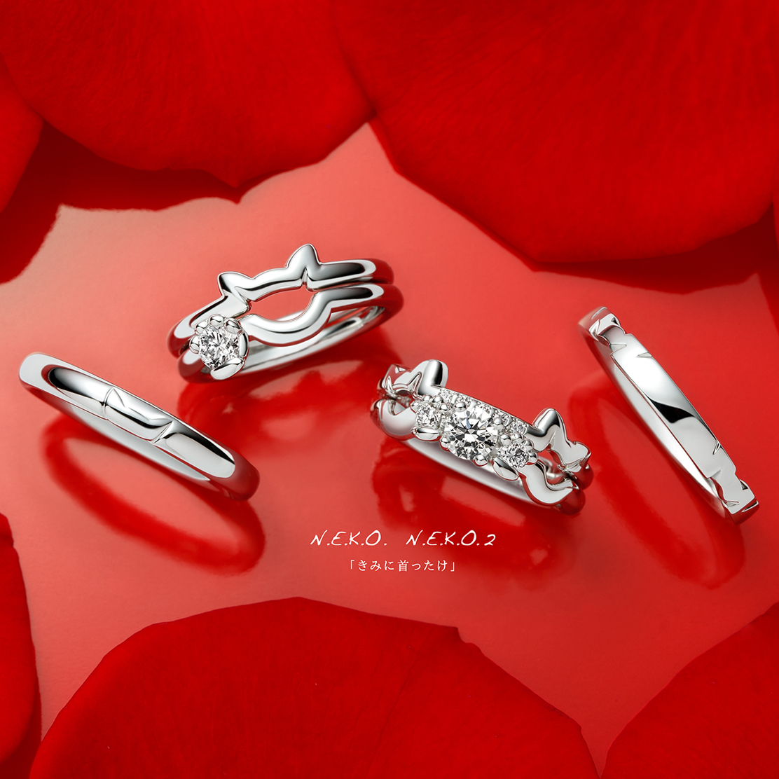 N.E.K.O.と同様に重ねてネコの顔になるデザインです。ポイントは結婚指輪が上、婚約指輪を下に重ねて着ける事です。N.E.K.O.2 はネコの顔が2ヶ所に現れます。N.E.K.O.と共通してシンプルかつ上質な印象はそのままに、少しだけ華やかさとデザイン性を高めた唯一無二のネコデザインです。