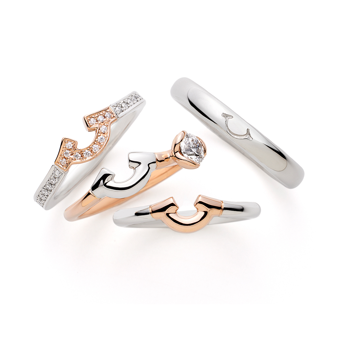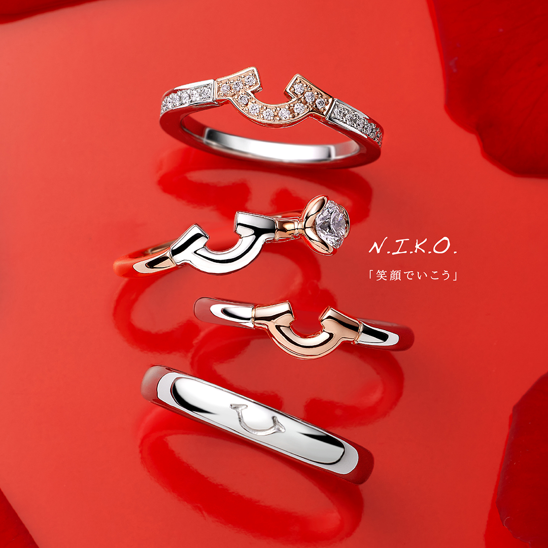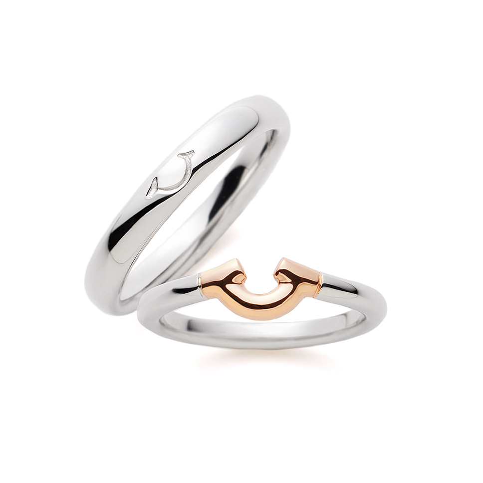 - ふたりの笑顔を象徴するデザインですので、重ね着けなどの組み合わせを自由に選んで頂けます。着け方の向きなどを変えて組み合わせる等ふたりが笑顔になるスタイルを追求してください。