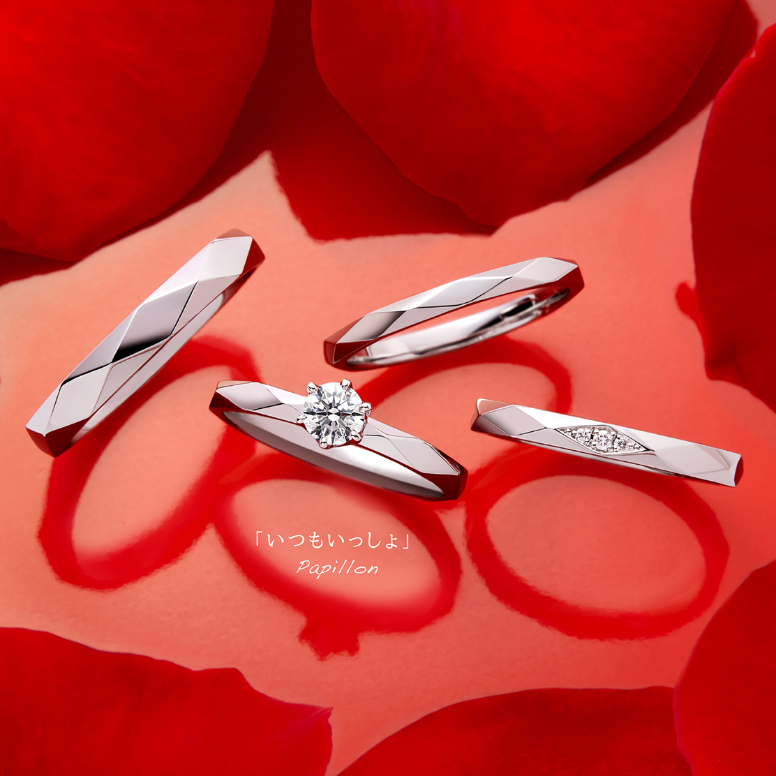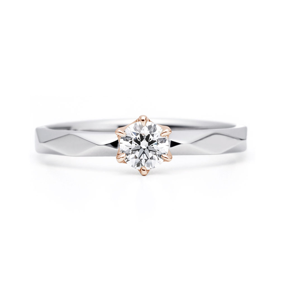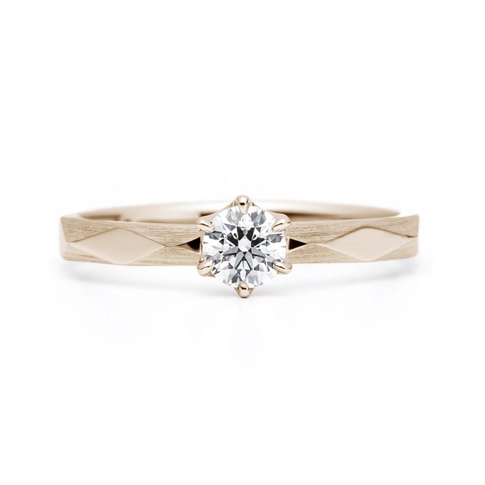 センターダイヤモンドのセッティングは6本爪です。です。指輪表面をファセットが覆う、キラキラ表面反射するデザインです。光の反射が蝶のはばたきを連想させます。シンプルなソリテールのデザインですが、その存在感は抜群です。指に通した時、いろいろな角度から見ても美しい指輪です。全てのタイプは、硬質な見た目に反し滑らかな着け心地で、重ねづけも美しく、婚約指輪と結婚指輪(ダイヤなし1/ダイヤあり)はもちろん、結婚指輪2本でも美しく重ね着けすることができます。