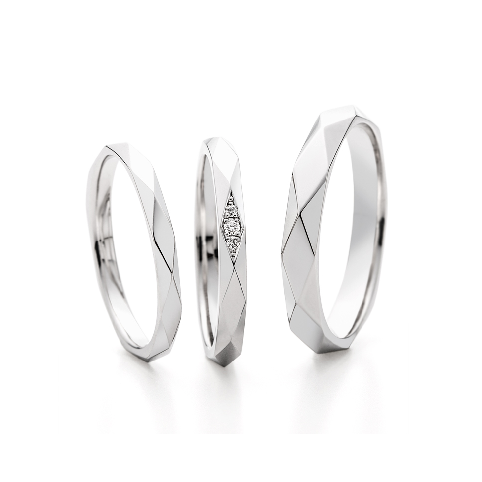 左:婚約指輪と同様に細身でファセットが美しいストレートラインです。