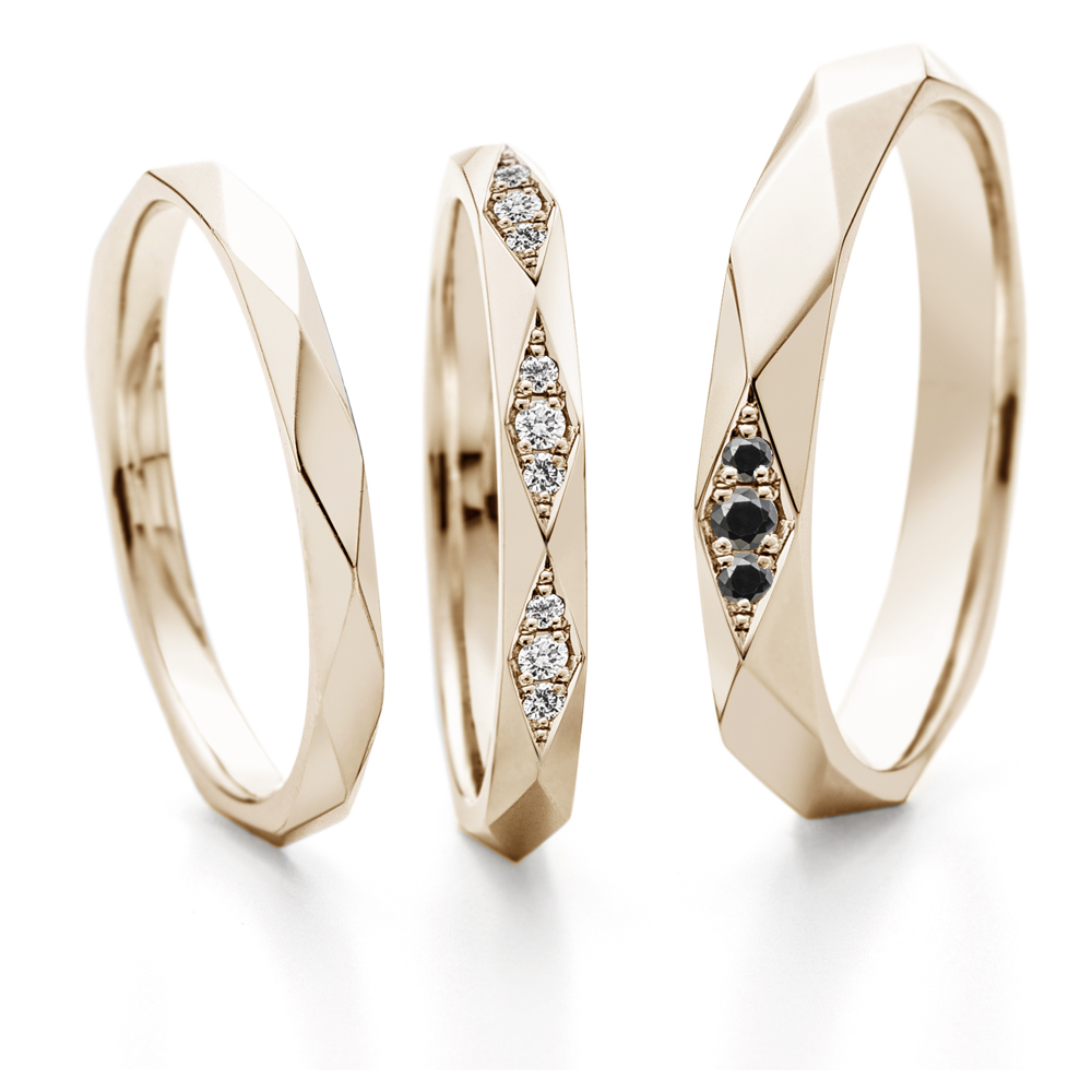 中央:幅が少し太いタイプです。正面の菱形パーツにメレダイヤモンド(0.01ct×1,0.005ct×2)を留めています。