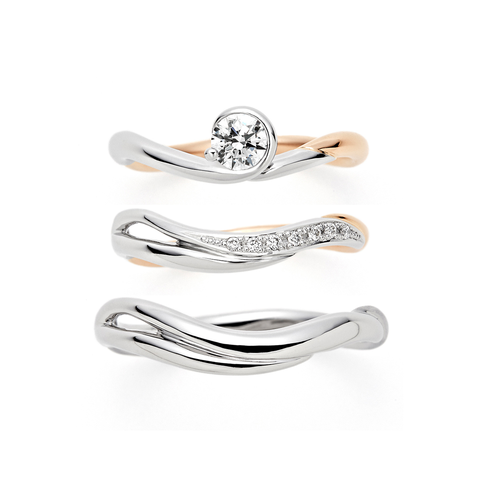 結婚指輪(中央):着ける向きが四方向あり”フローラルブーケ””シトラス””オリエンタル””ナチュラル”の4つの香りを連想させるシルエットです。その日の気分を形にして身にまとってください。プラチナ、K18ピンクゴールド、ダイヤモンドの3つの要素で香りが交わる独特なコンビネーションデザインです。メレダイヤモンド(0.005ct×7)をウェーブに沿って留ています。小指側には少し空間がありフェミニンな印象になり、指がしなやかに見える効果があります。中指側に流れるようにK18ピンクゴールドに切り替えており、色合いの変化を楽しんで頂けます。