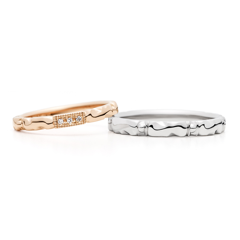 - 左:婚約指輪と同様に細身のアンティークテイストです。正面はメレダイヤモンド(0.005ct×3)をミル打ちで囲んだパーツで、指輪全体には立体感のある装飾を施し、程よい高級感と可愛らしさで「扉」のイメージを演出しています。