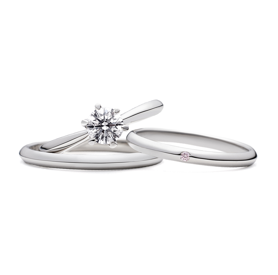 結婚指輪(右):シンプルなストレートライン基本に丸みを持った山型の指輪に、ピュアな気持ちの象徴としてピンクダイヤモンド(0.01ct×1)を留めています。