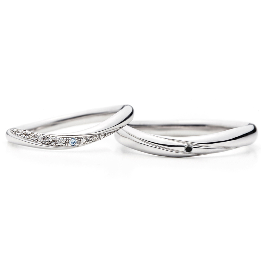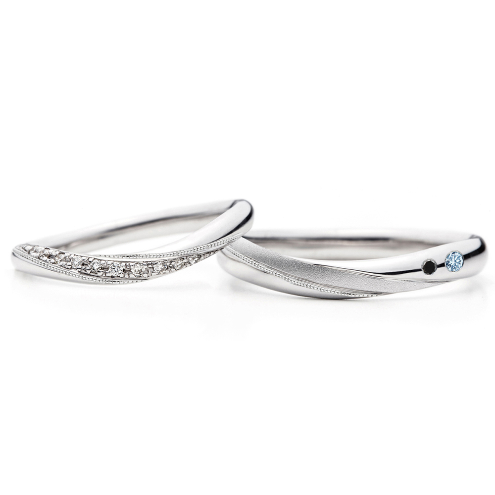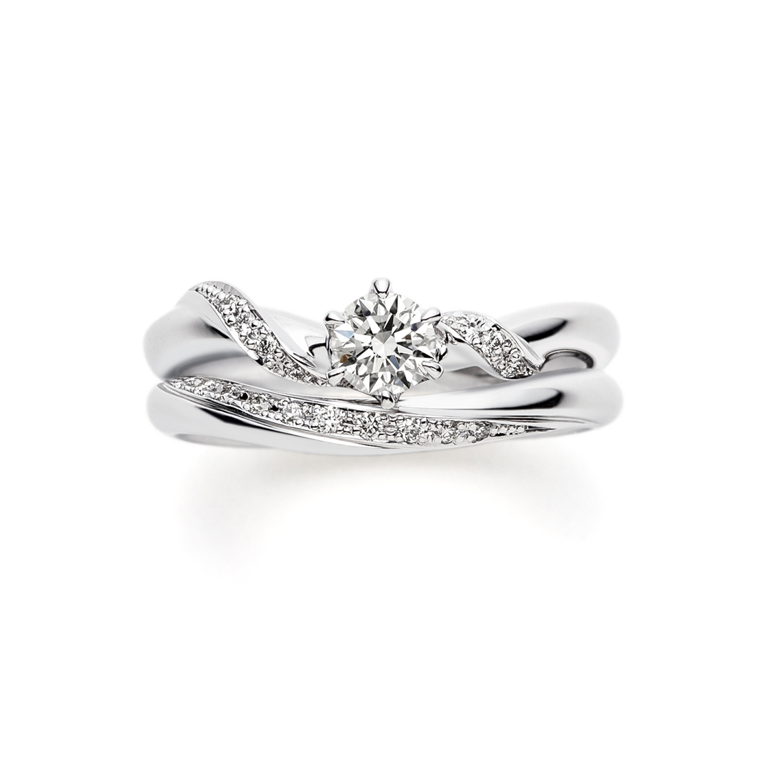 - 左:緩やかな水の流れのようにウェーブラインを描き、メレダイヤモンド(0.005ct×10)で水の流れを表現しています。側面まで綺麗に巻き込んで留めているので、自分自身から見ても、相手から見ても輝きが程良く存在感を発揮します。シルエットは緩やかなU字ラインのウェーブです。