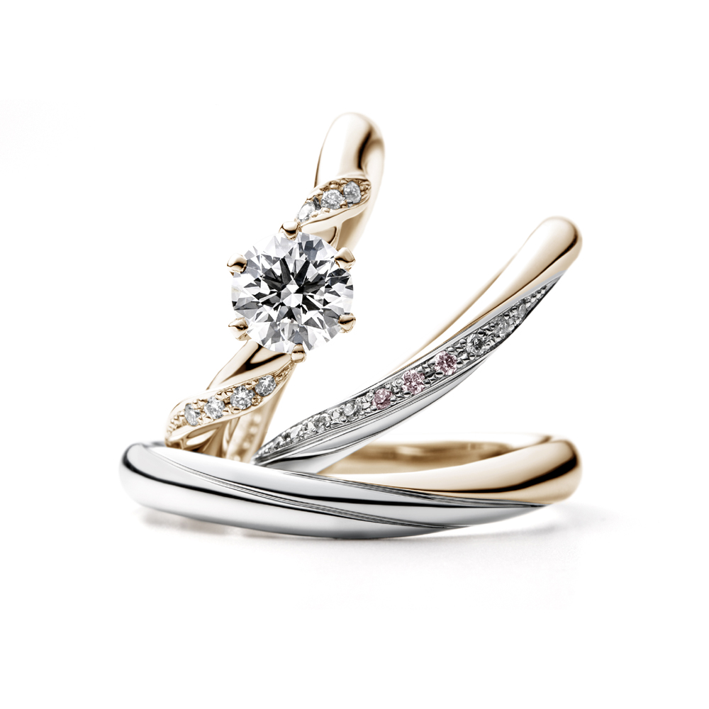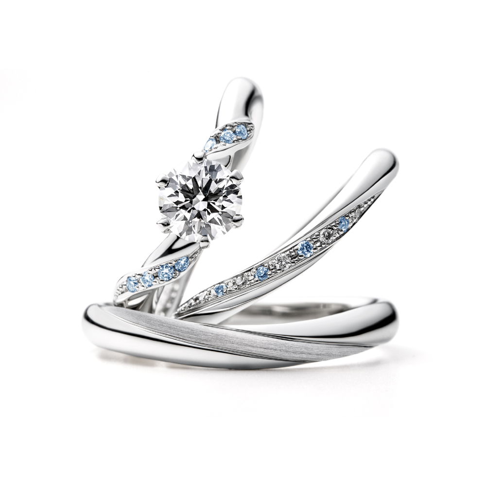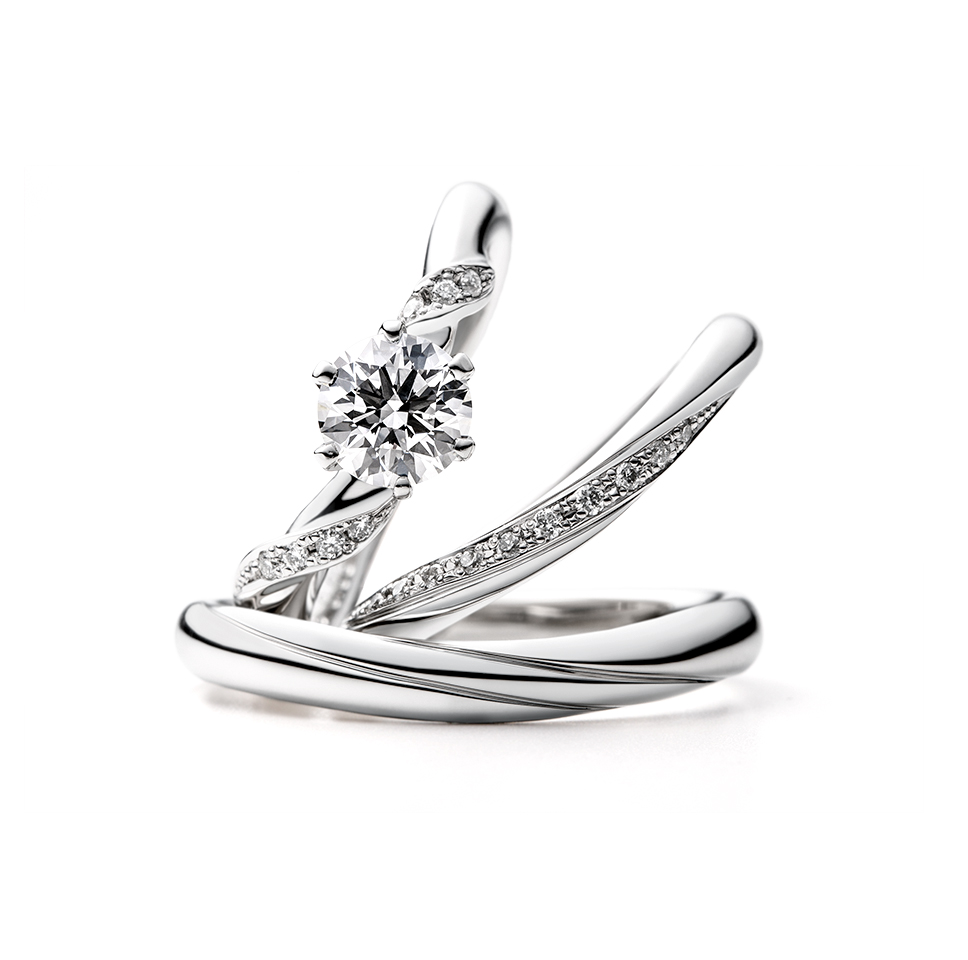- 婚約指輪:センターダイヤモンドのセッティングは6本爪です。V字ラインの腕に左右のメレダイヤモンド(左側:0.005ct×4,右側:0.005ct×3)のパーツが巻きついています。小さな滝をこえるような水の流れをイメージしています。流れる様なダイヤの並びに清涼感を感じられます。程よい存在感とセンターダイヤモンドの輝きが調和した、美しい指輪です。