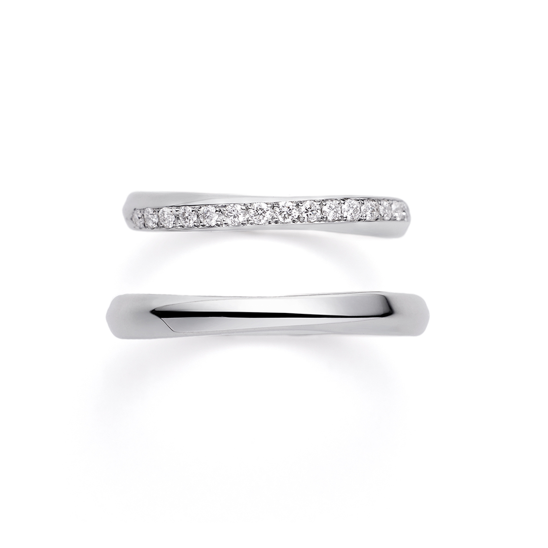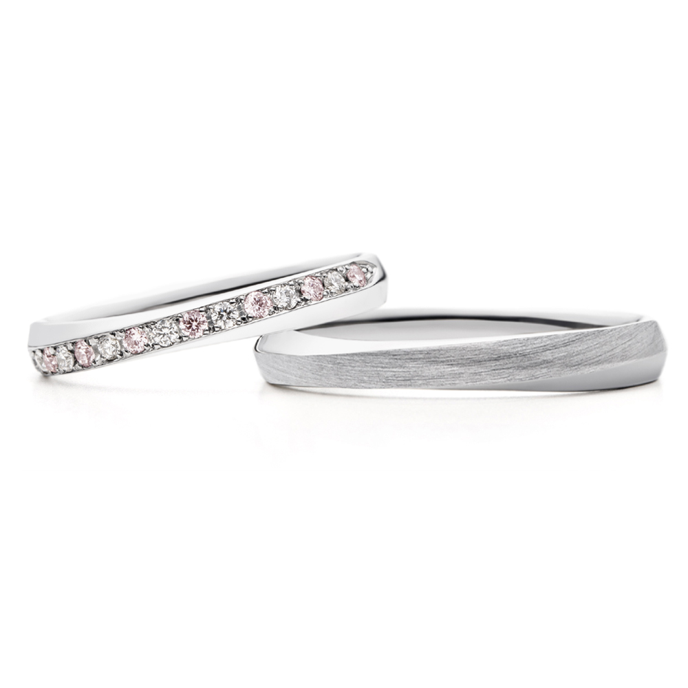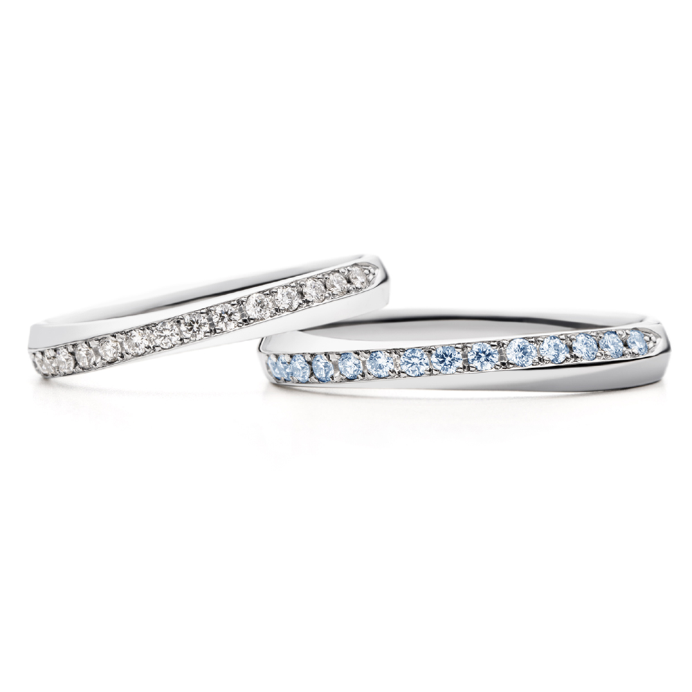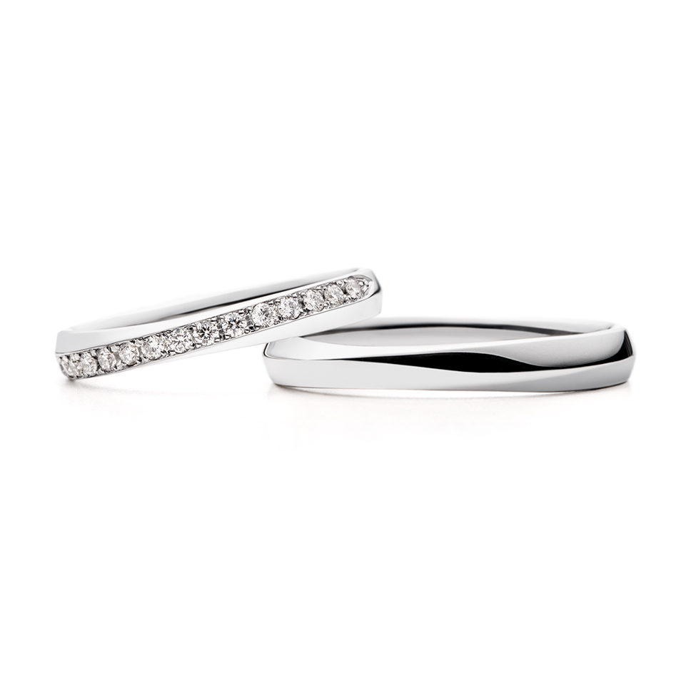 左:右肩上がりのウェーブラインですっきりと着けられるフォルムです。正面にはウェーブに添って美しくダイヤモンド(0.01ct×15)が輝きます。指に通すと、プラチナの艶やかさとダイヤモンドが指に馴染み、品格を感じられます。