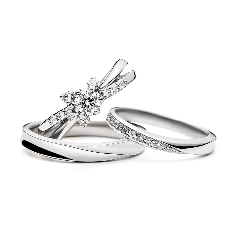 婚約指輪:センターダイヤモンドは6本爪です。メレダイヤモンドが周りに散りばめられたデザインです。センターダイヤモンド上部には、メレダイヤモンドの小さな石枠がふたつ(右0.02ct, 左0.03ct)、右下にはひとつ(0.02ct)。また、腕にも左右3ピースずつ(0.014ct×6)配置され2本のリングが交差しているのが特徴です。手の平側で、1本に繋がっています。ウェーブラインと空間のあるリングは軽やかな仕上がりです。