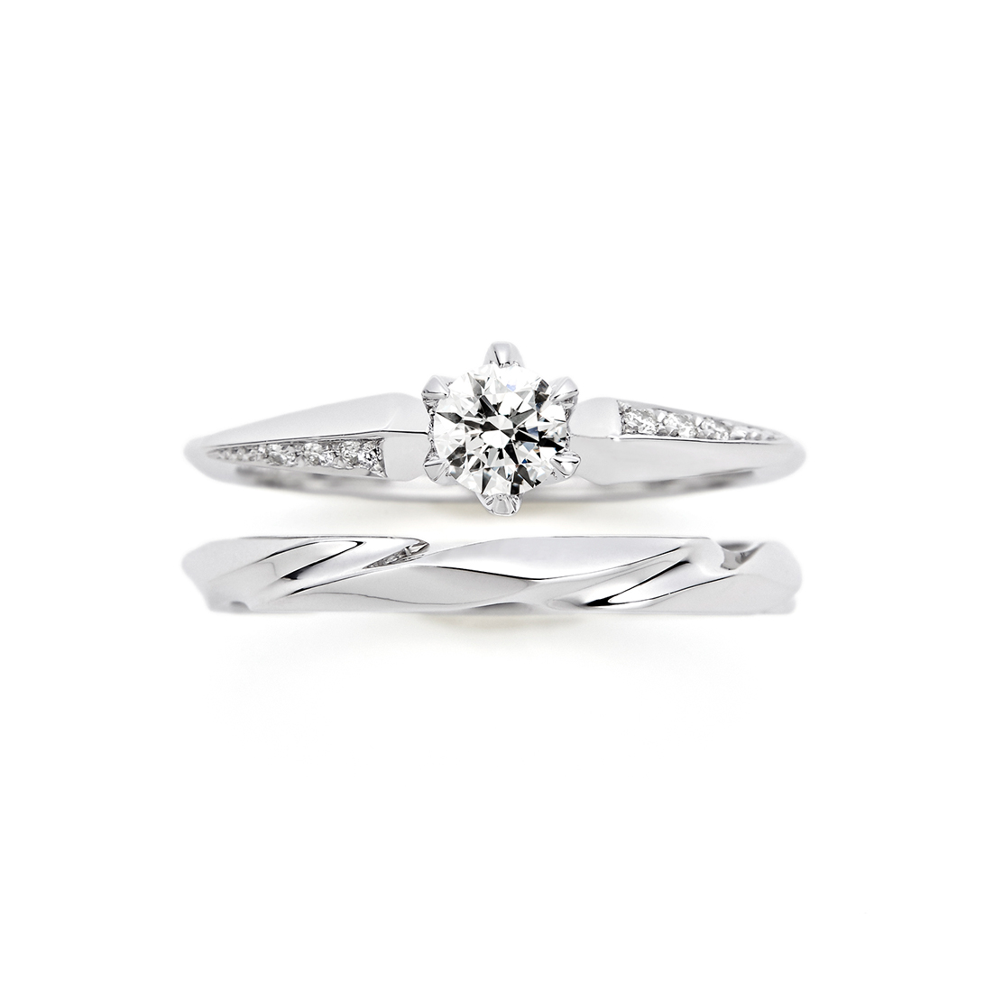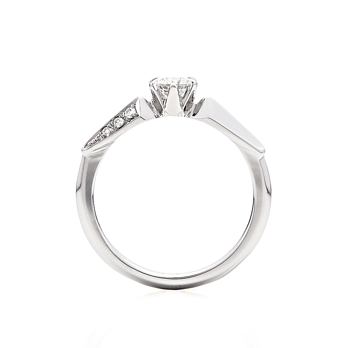 - 直線を基調とした細身のラインで、繊細なイメージです。指をとても綺麗に見せられます。腕の上下の面にはメレダイヤモンド(0.007ct×2,0.006ct×2,0.005×2)を留めています。太陽のような眩い輝きを放ちます。