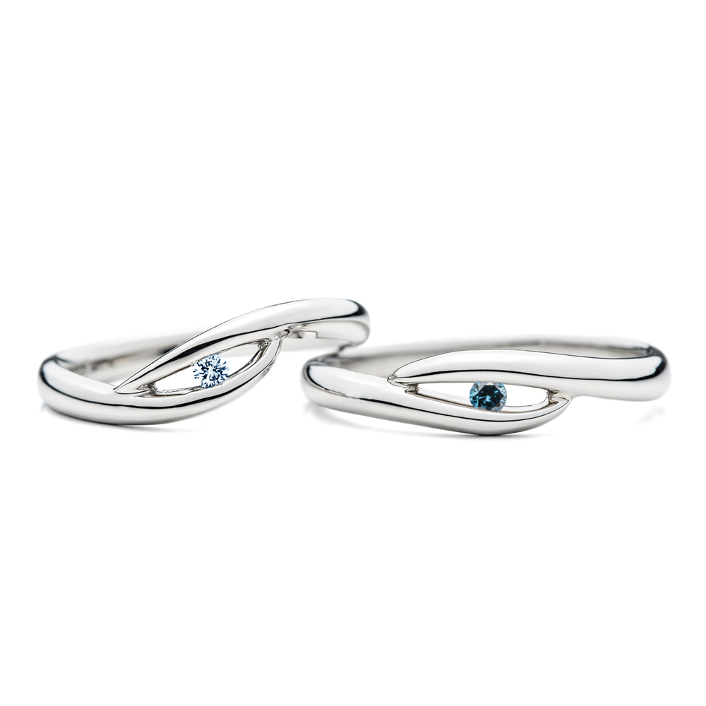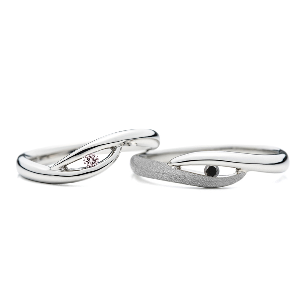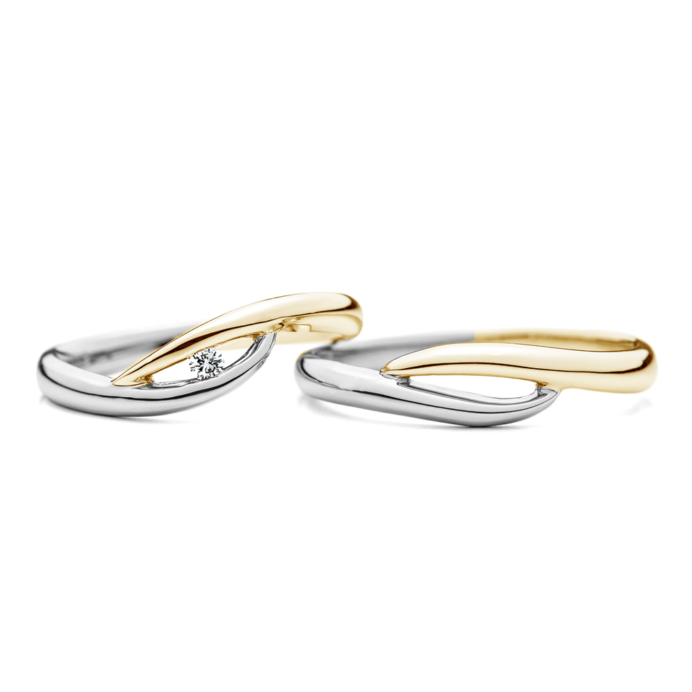 右:ほぼV字を感じないウェーブラインで、結婚指輪(ダイヤあり)と同様に下の巻き込みがクルッと強く巻き込んでいます。