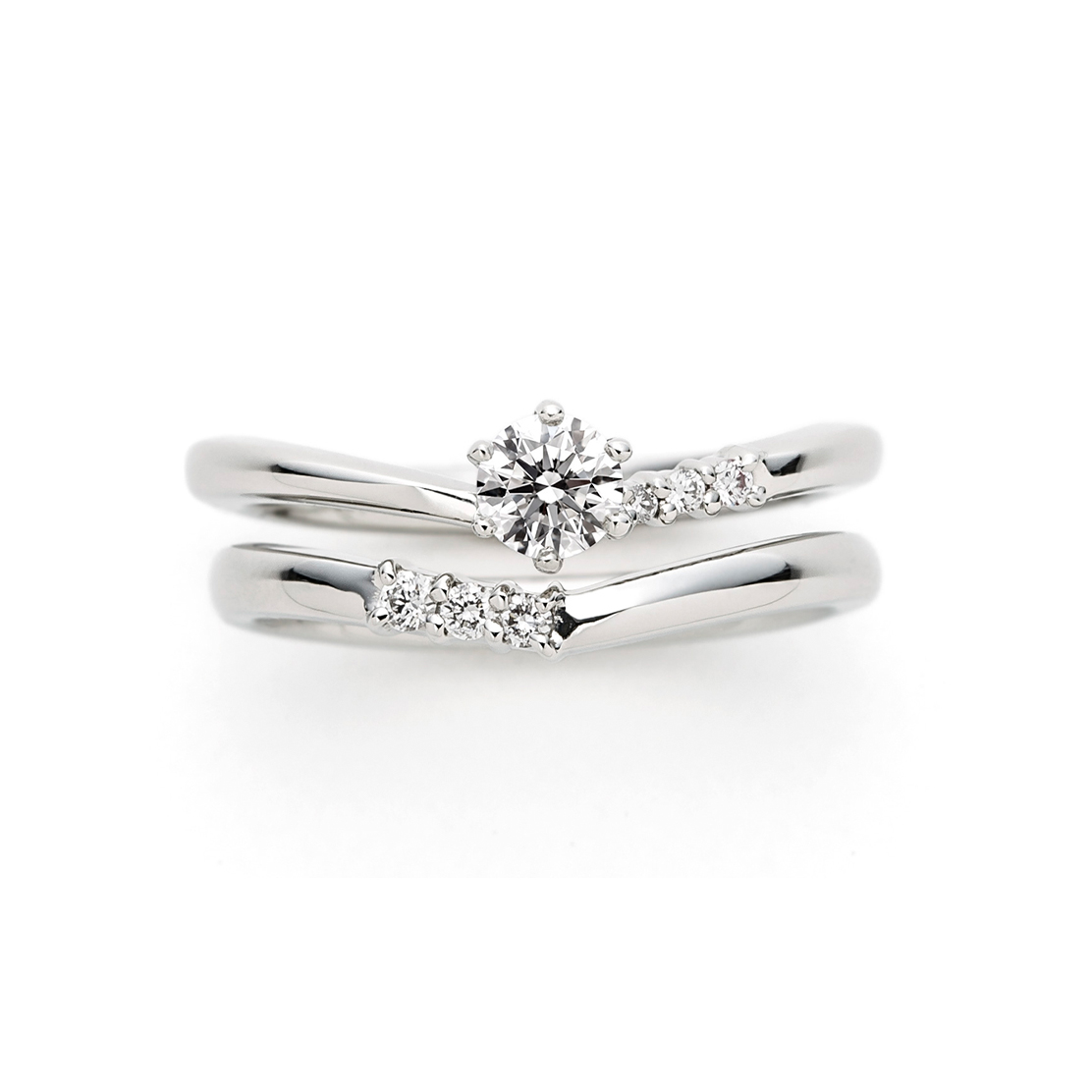 左:V字ラインの左側にすずらんの花をイメージしたメレダイヤモンド(0.02ct×1,0.016ct×1,0.0125ct×1)を留めています。婚約指輪と同様に中央に向かって小さくなる爪留めです。細身のV字ラインで指長効果も抜群です。