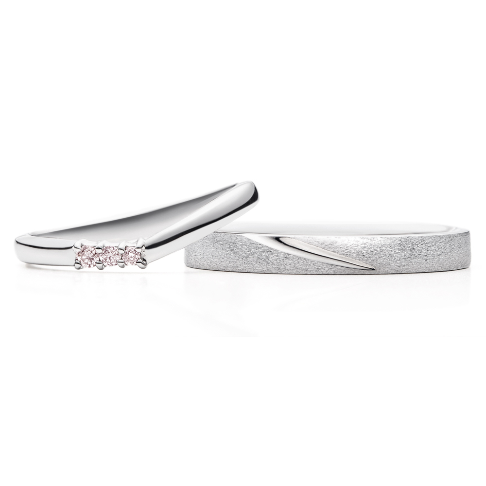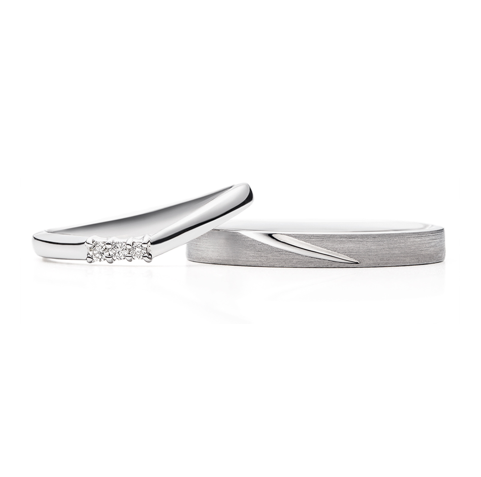 右:平打ちストレートのデザインで、表面はヘアーライン仕上げで、すずらんの葉をイメージさせる溝はグロス仕上げを施したデザインです。
