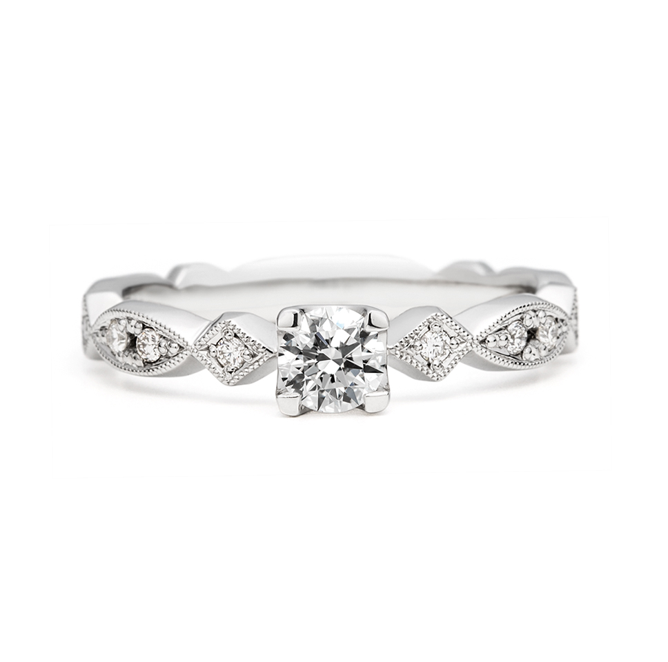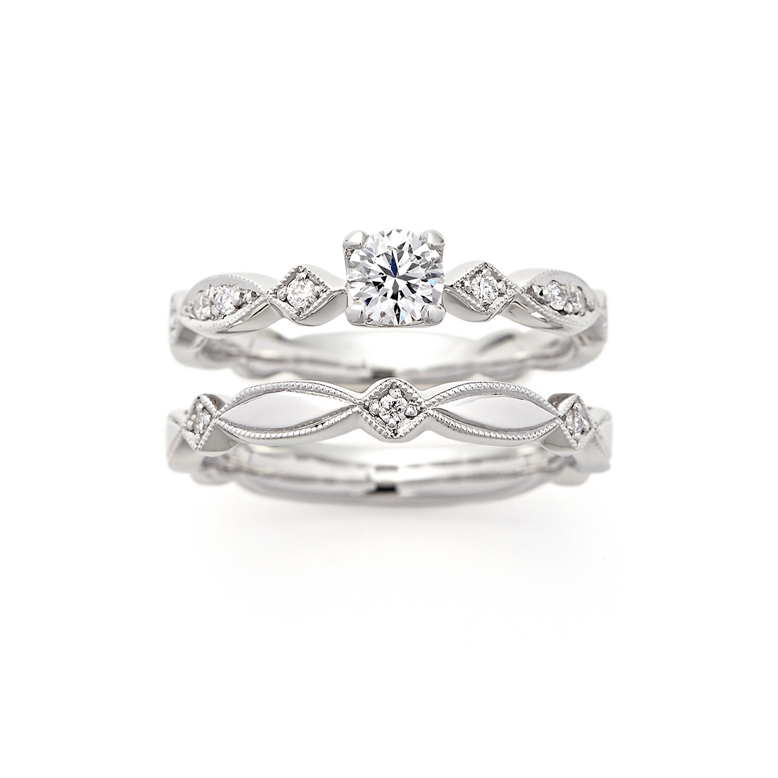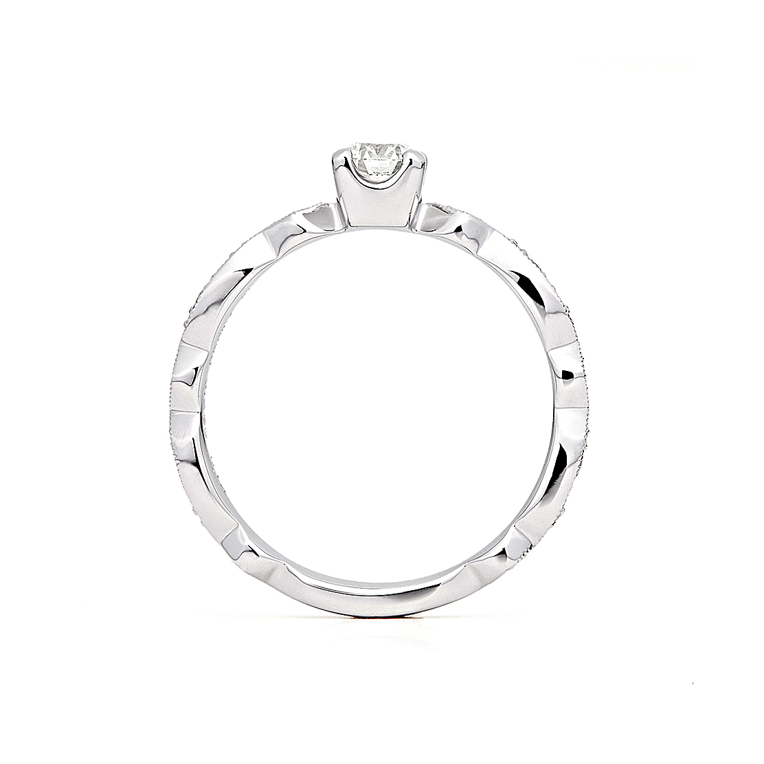 - サイズ直し箇所を除き、全てのパーツにメレダイヤモンド(0.01ct×14)とミル打ちが施されています。ファッション指輪感覚で着けて頂けるのと同時に上品で繊細な雰囲気をまとった婚約指輪です。表面パターンに応じて側面には凹凸がありますので、全体のフォルムをデザインとして楽しんで頂けます。