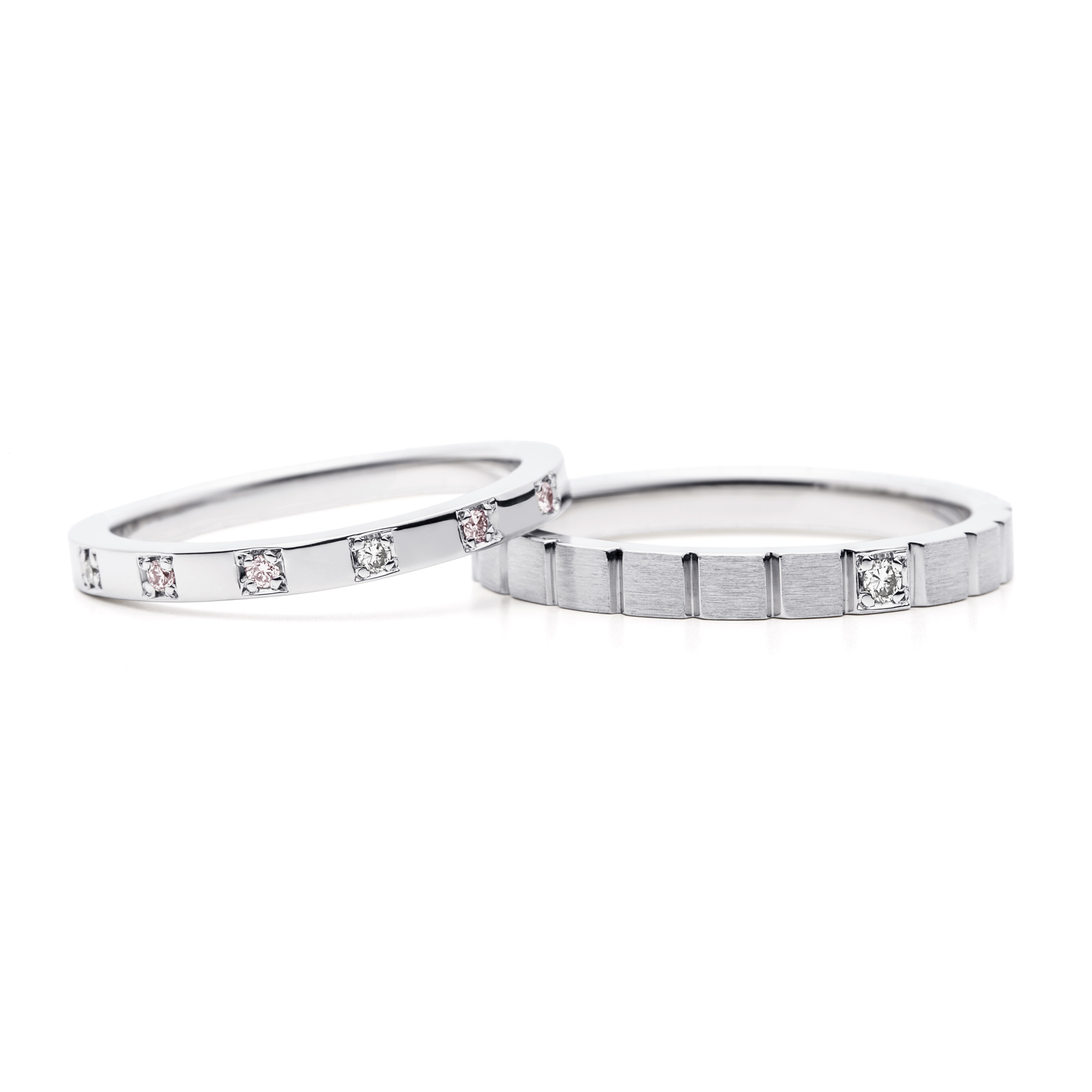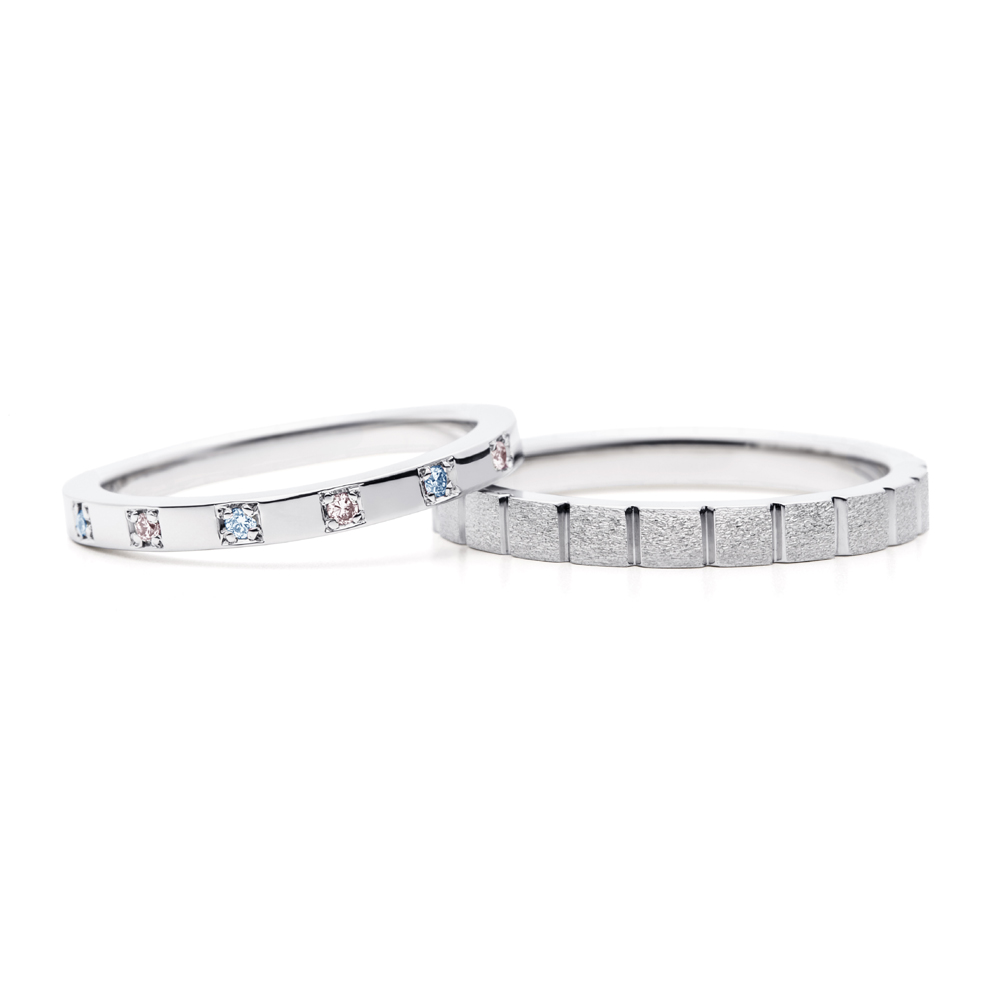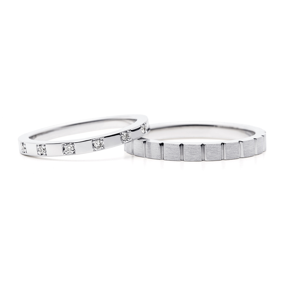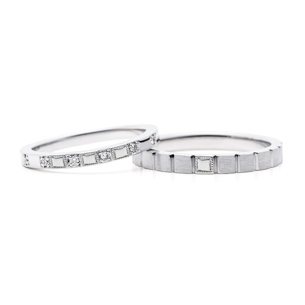 右:結婚指輪(左)と同様、スクエアの配列がスタイリッシュな指輪です。ヘアーライン仕上げと溝のグロス仕上げでメリハリがあります。