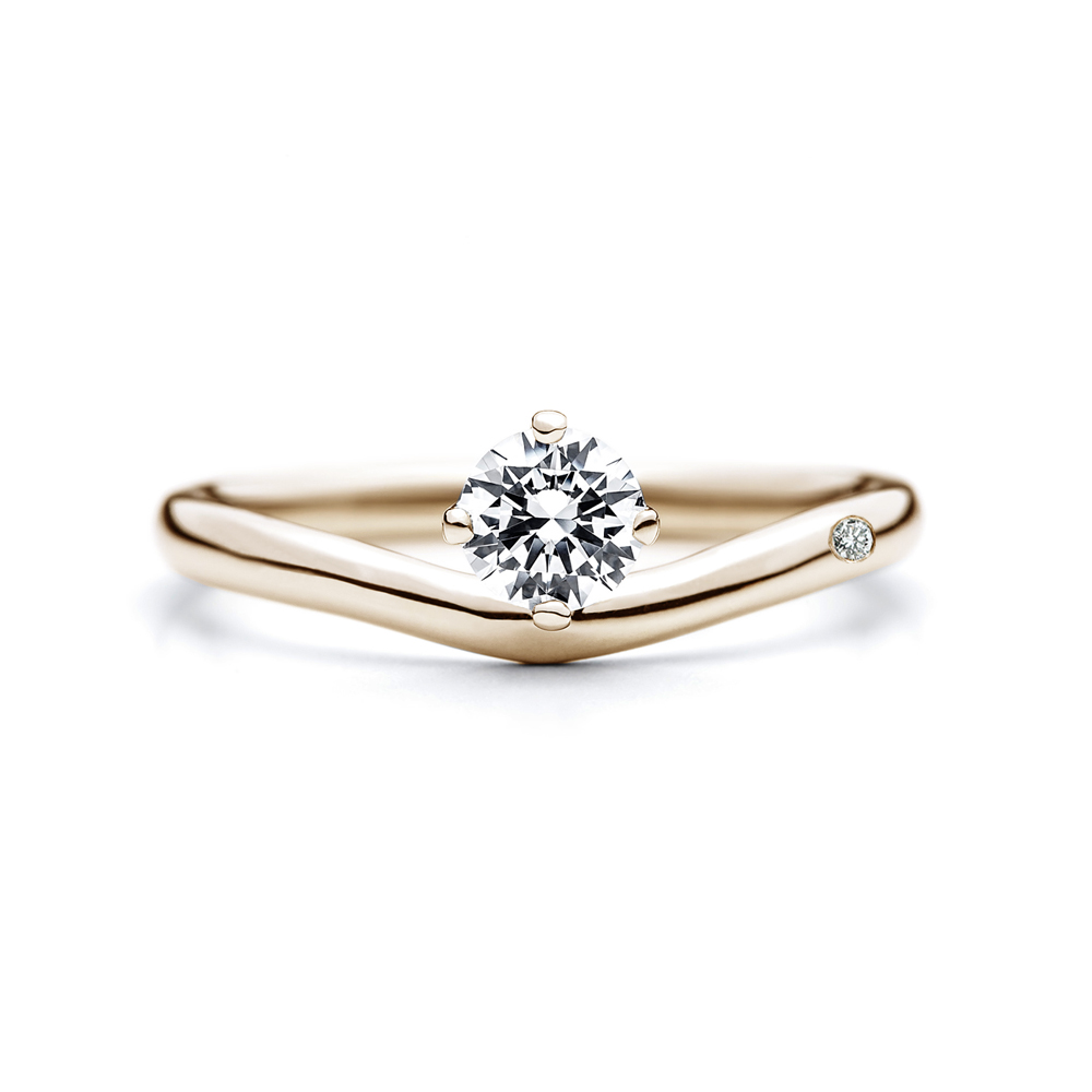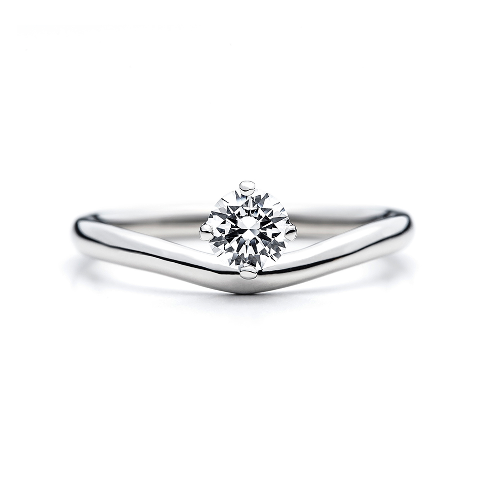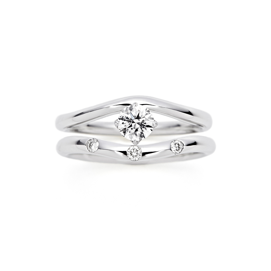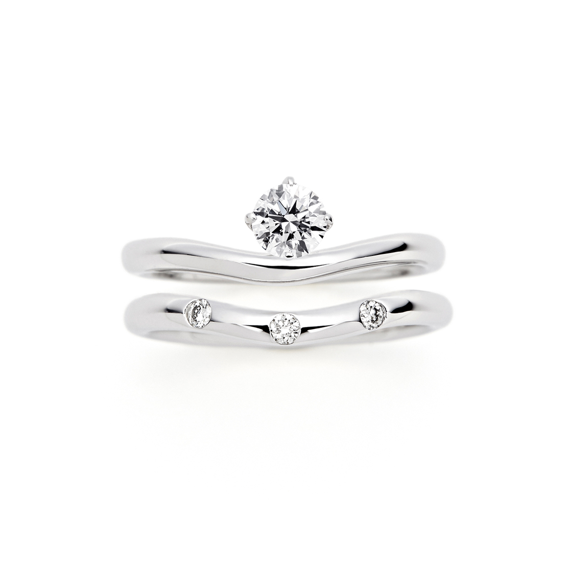 センターダイヤモンドは4本爪です。結婚指輪との重ね着けが2通りあることが最大の特徴です。結婚指輪を基準に婚約指輪の向きを変えても、美しく重ね着けできます。センターダイヤモンドが下になるように着ければ、結婚指輪と婚約指輪の腕の中央にセンターダイヤモンドが輝き、まるで一本の指輪のように見えます。